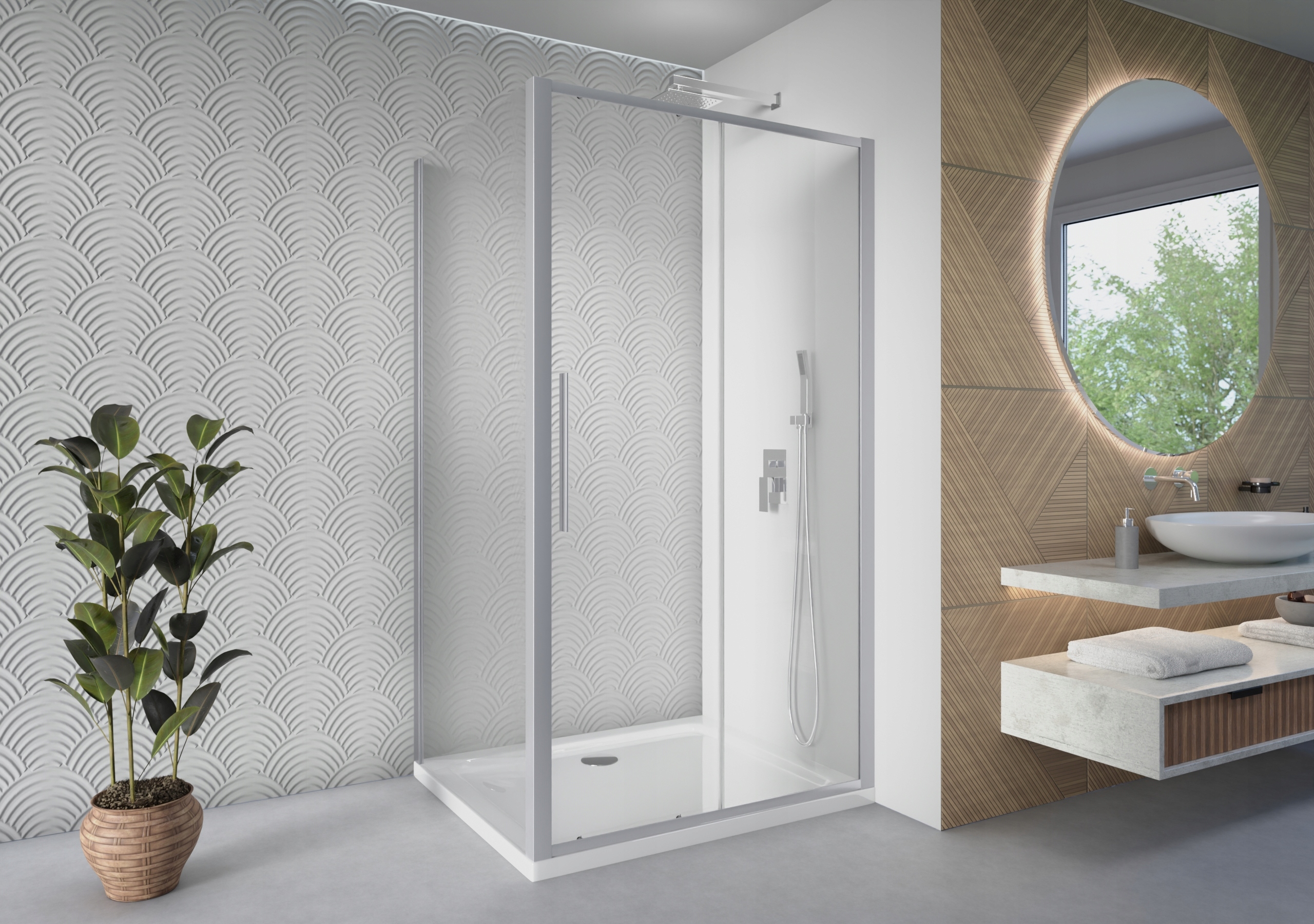У всіх наших душових кабінах, душових дверях, стінах та екранізації розширення ми використовували профілі, які дають вам можливість зменшити будь-які нерівності стін. Діапазон коригування був розроблений таким чином, що з одного боку він дозволяє пристосувати продукт до кривих стін, а з іншого полегшує оптимальне регулювання продукту відносно підкладки.