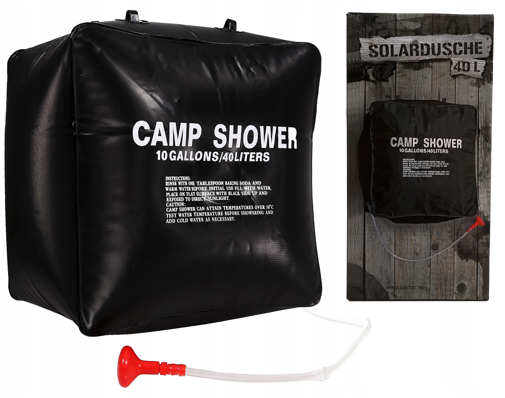 Польовий сонячний душ. Продукт німецького бренду Mil-Tec®. Виготовлений з товстого, надзвичайно міцного та гнучкого ПВХ матеріалу. Нетоксичний матеріал, гарантує безпечне використання. Його невеликі розміри в складеному вигляді і мала вага дозволяють упакувати його навіть в невеликий рюкзак. Для нагріву води використовує тільки сонячне тепло, можна використовувати на польовій кухні для миття посуду.