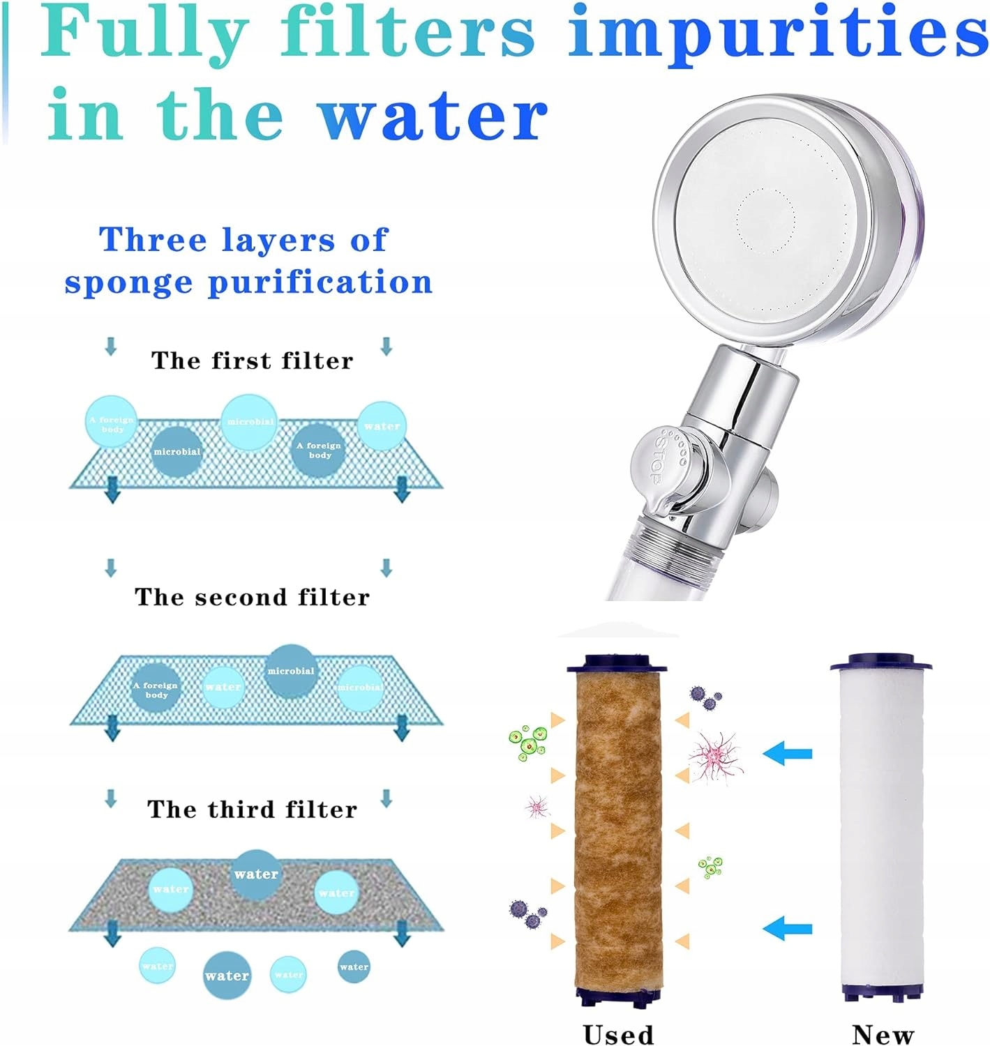 - Система фільтрів: наш фільтр для душової головки для жорсткої води з поліпропіленовим бавовняним фільтром, який ефективно усуває більшість домішок у воді та захищає здоров’я та безпека вашої сімейної шкіри. Якщо ви помітили, що фільтр жовтіє, вчасно замініть його на новий.