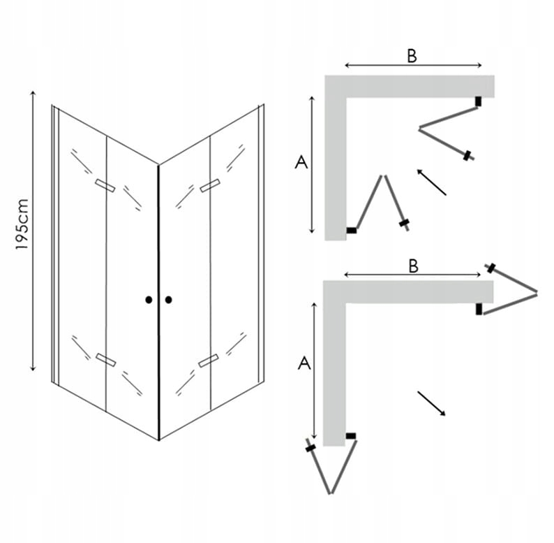 Кутова кабіна з подвійним відкиданням як зовні, так і всередині. Петлі, які використовуються в дверях, забезпечують надзвичайно широкий вхід. Універсальна ліва або права кабіна. Ідеально підходить для маленьких ванних кімнат.
