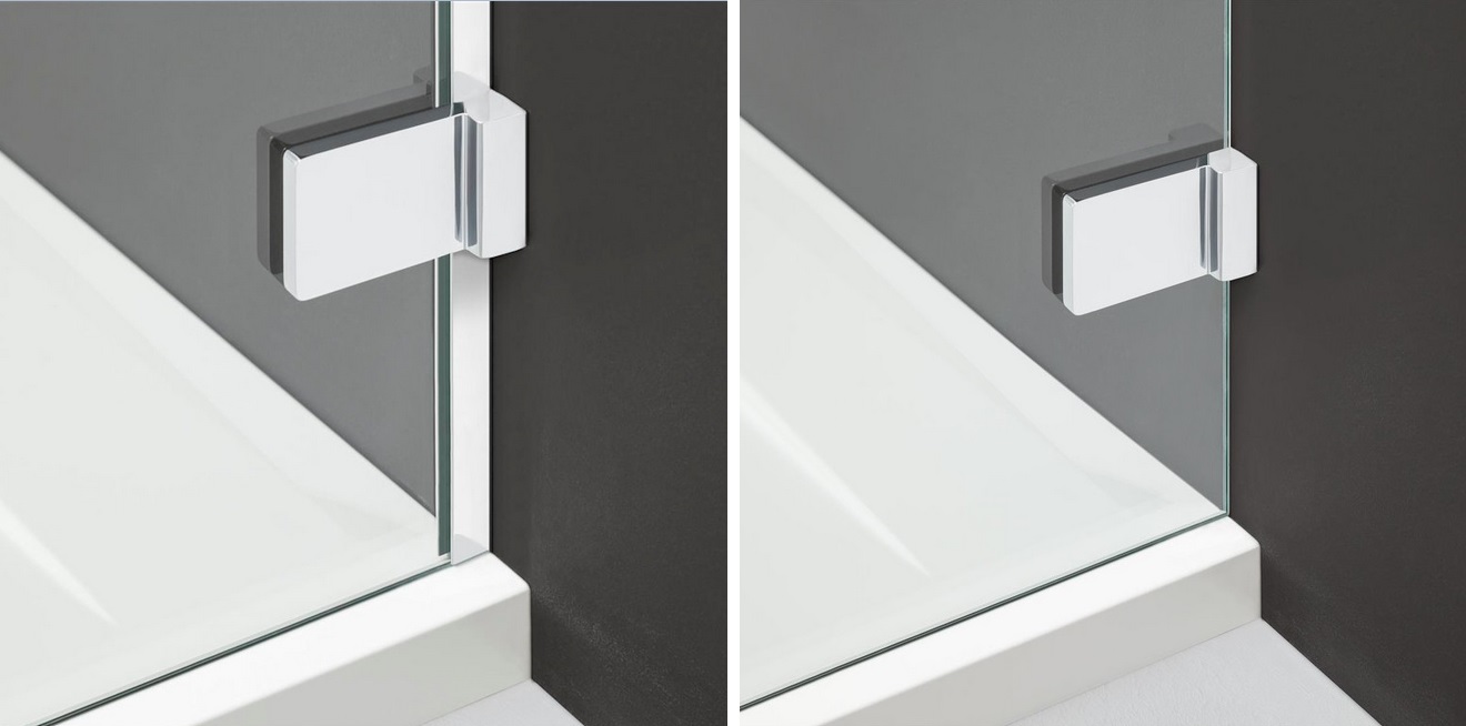 На фото внизу зліва показані поворотні петлі з механізмом підйому та опускання дверей. Посередині петлі врівень зі склом полегшують очищення. З правого боку розташовані стабілізатори, що забезпечують міцну конструкцію кабіни.
