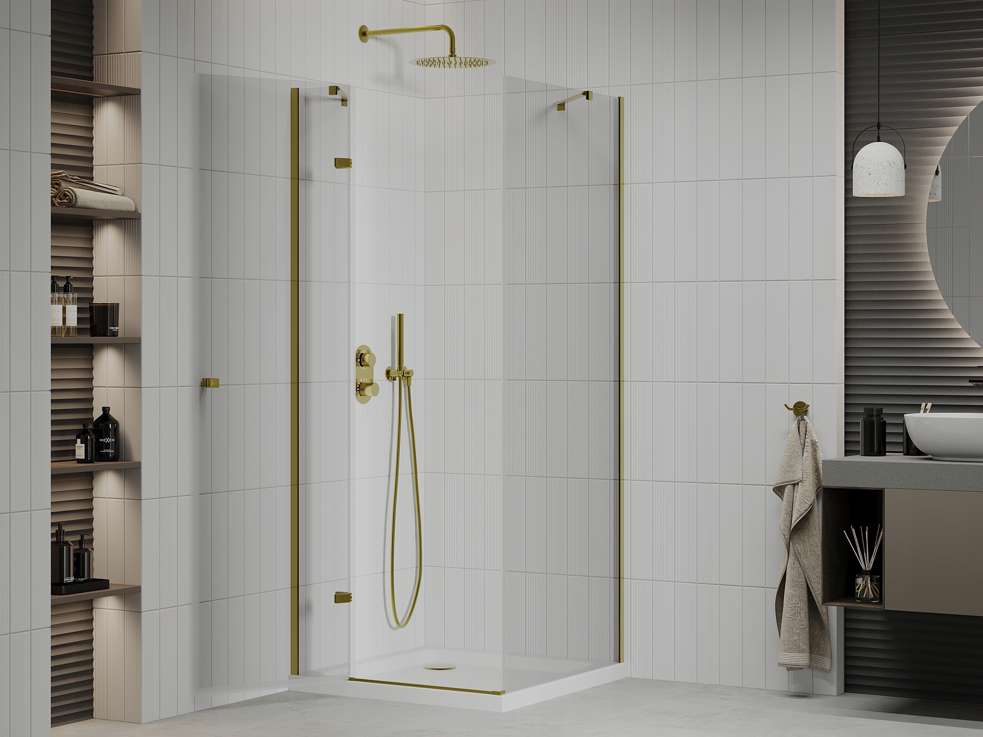 Відкидна душова кабіна Mexen Roma 80 х 80 см, прозора, золото + піддон Flat, білий + сифон, золото