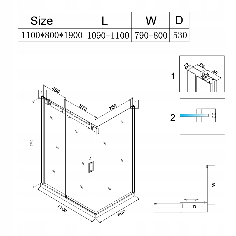 У всіх душових кабінах ми використовували профілі, які дозволяють компенсувати нерівності стін до 20 мм. Діапазон регулювання розроблений таким чином, що, з одного боку, дозволяє пристосувати виріб до кривизни стін, а з іншого боку, це сприяє оптимальному пристосуванню виробу до душового піддону або підлоги. .