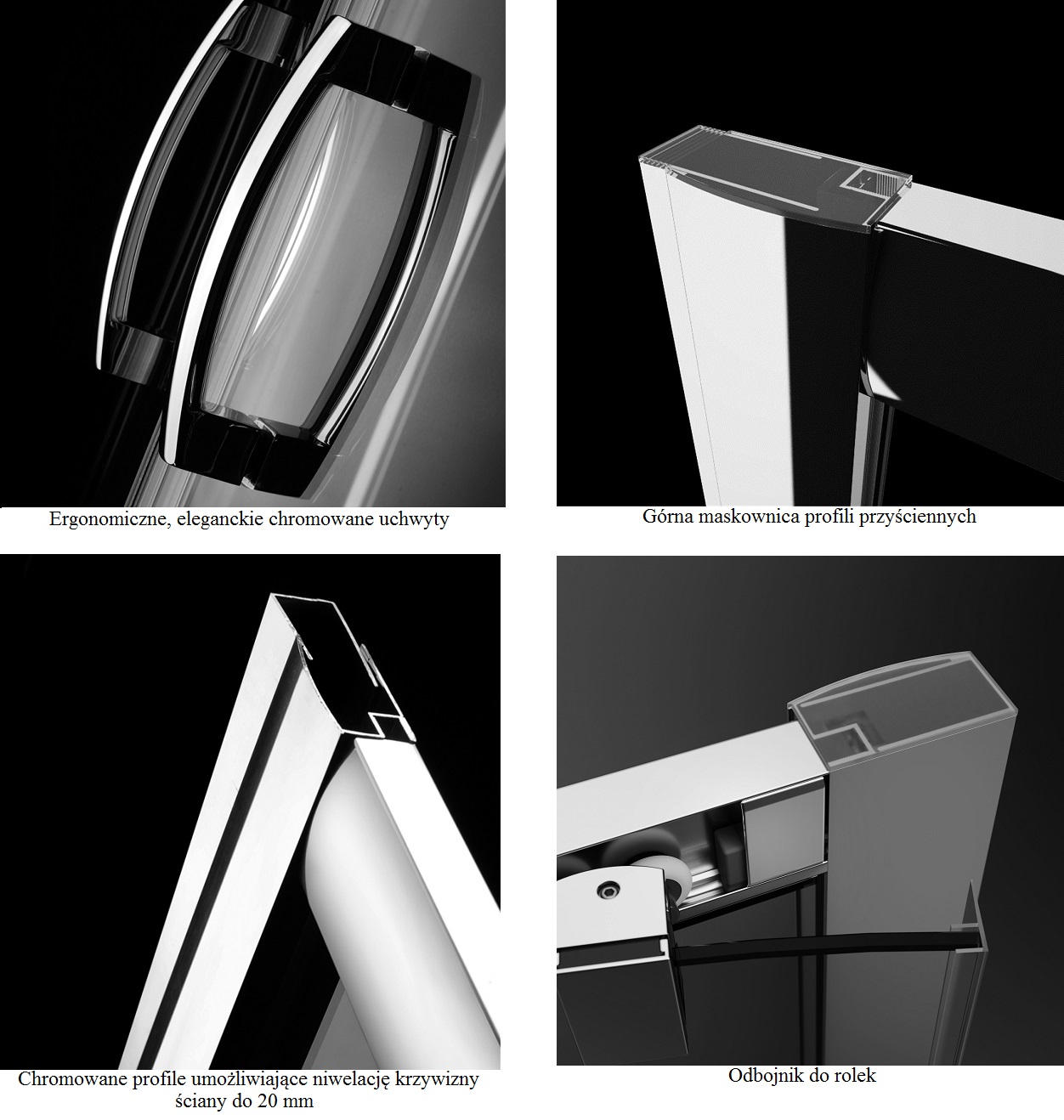 - Розсувні двері, шарикопідшипники, поворотні ролики в хромованому корпусі