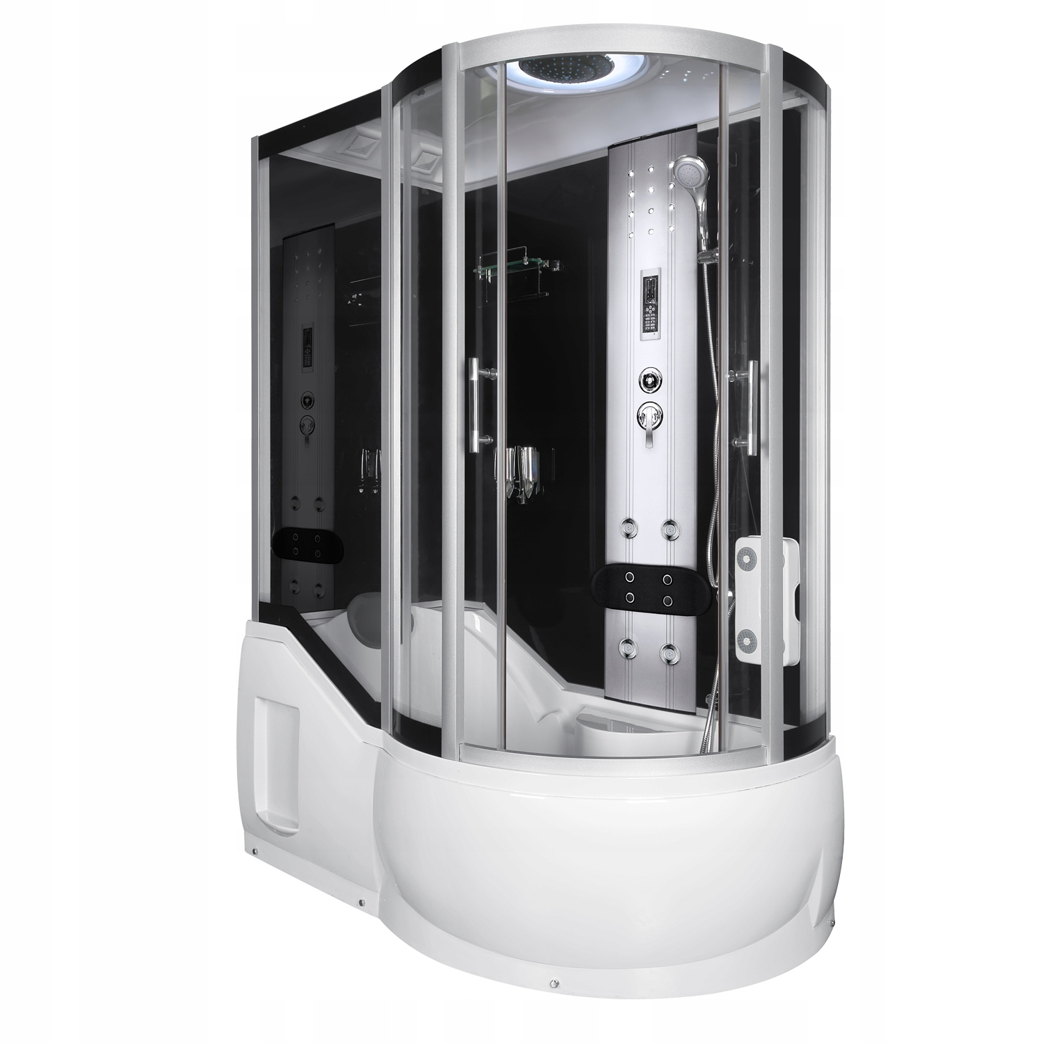- Обладнання : вбудоване сидіння, FM-радіо, вентилятор, освітлення, скляна полиця, вилив для ванни, дозатори для мила, підголівник, масажер для ніг, тропічний душ, душова трубка, душовий шланг