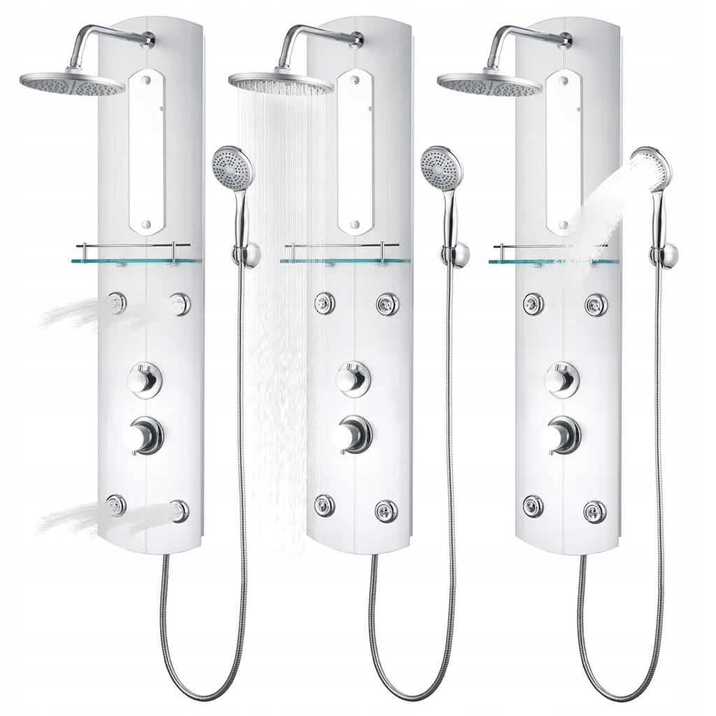 Основний елемент душової панелі виготовлено з пластику, який легкий і тому зручний у використанні. Він пропонує 3 варіанти душу: тропічний душ, водний масаж і душову лійку. Панель містить вбудоване маленьке дзеркало. Скляна полиця використовується для розміщення продуктів, необхідних у душі, а силіконові насадки стійкі до вапняного нальоту.