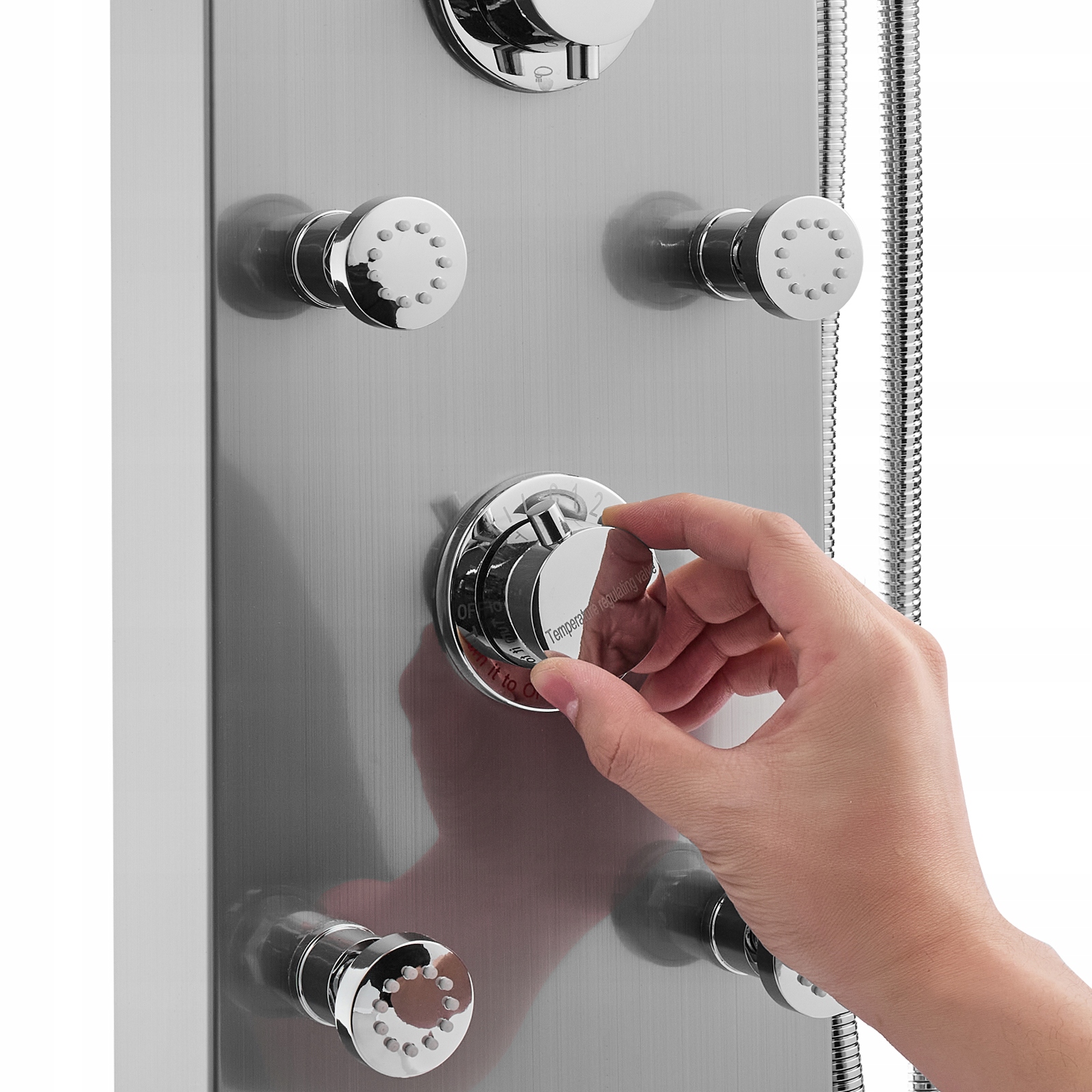 Наші душові панелі найвищої якості є ідеальним доповненням до сучасних ванних кімнат. Будь то освіжаючий дощ або розслабляючий масаж - наші душові панелі виконають ваші бажання. Панелі виготовлені з високоякісної нержавіючої сталі 304 і елементів з латуні, що забезпечує довговічність і стійкість до корозії. Світлодіодне освітлення та відображення температури додають нотку сучасної елегантності.