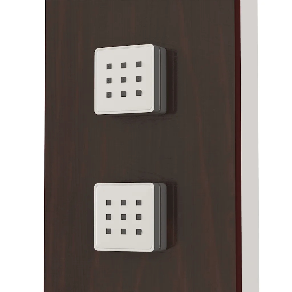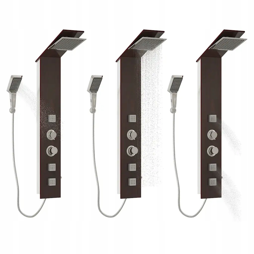 Багатофункціональна душова панель представляє стильний дизайн, завдяки якому він буде ідеальним доповненням до вашої ванної кімнати. Душова панель виготовлена з високоякісної склянки з красивим принтом на візерунку деревини. Він має три функції: дощовий душ, масажні форсунки та ручна спрей -голова, яку можна легко обрати ручкою.