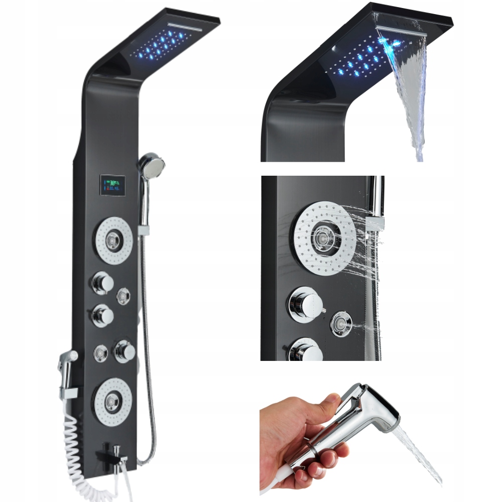 Це ексклюзивна, стильна душова панель з гідромасажем, водоспадом, тропічним душем, трубкою-біде, нижнім виливом і душовою лійкою.