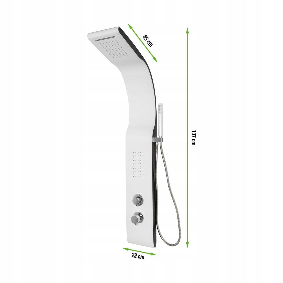 Гідромасажна душова колонка Evodi з 1 масажною панеллю, змішувальним краном і блискучим хромованим покриттям. Прямокутна душова лійка має 2 дощові форсунки та гнучкі насадки на основі силікону для легкого очищення. колонка має одноструменеву гідромасажну панель з ефектом водоспаду, що ідеально підходить для комфорту та зручності вашої спини. Розміри: 20 x 137 x 55 см (ширина x висота x глибина). Розмір душової лійки: 14 x 21 см (ширина x висота).