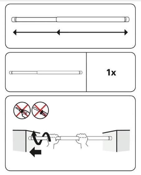 Просте встановлення є її головною перевагою - просто виберіть відповідний розмір штанги для місце, де він буде кріпитися, а потім відкрутіть карниз так, щоб він тиснув на обидві стіни. При правильному натягу він стійкий і здатний витримувати багато кілограмів. Цей спосіб безпечний і не пошкоджує стіни, оскільки має гумові ніжки на кінцях.