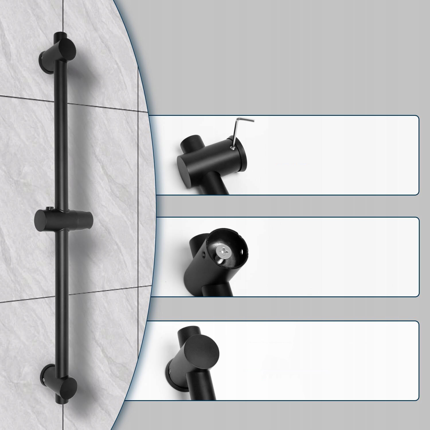 🚿【Душова штанга з нержавіючої сталі】Кругла чорна душова штанга довжиною 66 см виготовлена з високоякісної нержавіючої сталі, що не містить свинцю, стійка до вологи та корозії, міцна та зносостійка. Діаметр душової штанги 25 мм, простий, але класичний дизайн, універсальний для невеликих приміщень/кімнат і для кутової установки.