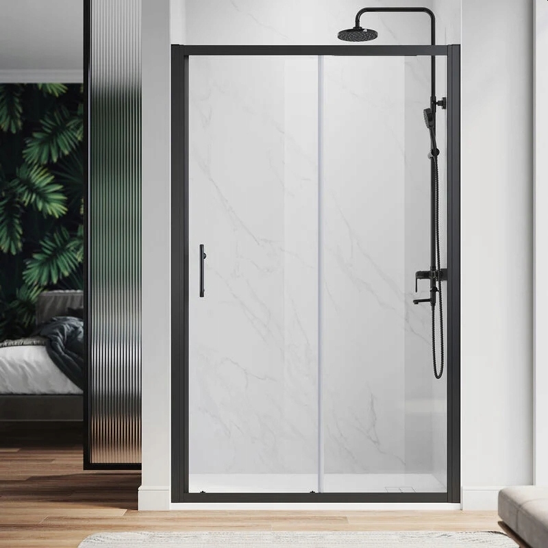 Високоякісні розсувні душові двері із загартованого прозорого скла товщиною 6 мм, алюмінієві профілі, ручка відкривання та ролики - матове чорне покриття. Душові двері можна монтувати на піддон або прямо на підлогу. У цих душових дверях використовується система ходових роликів з можливістю легкого та швидкого видалення ходового скла (наприклад, для очищення поверхні виробу). Двері для душової кабіни, призначені для установки в нішу, зі збільшеною висотою до 195 см. Ми також пропонуємо такі ж душові двері в розмірах 100x190, 110x190, 120x190, 130x190 і 140x190 см. Повні технічні характеристики нижче.