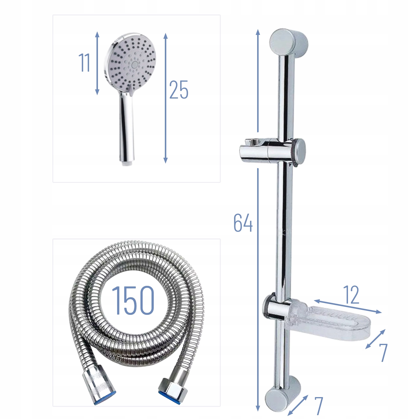 Душовий гарнітур, колонка, душова штанга, шланг, 150 см, душова полиця хром
