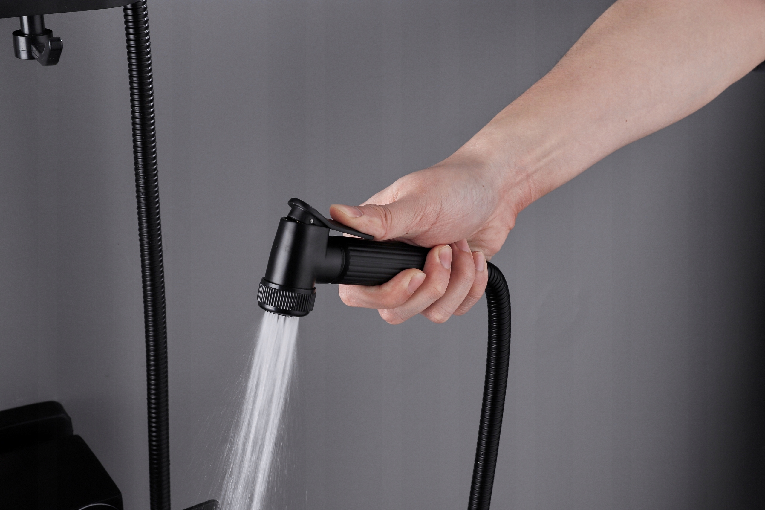Душовий набір має багато душових функцій (верхній душ, нижній душ, душова лійка, біде) і керуються за допомогою кнопкина змішувачі