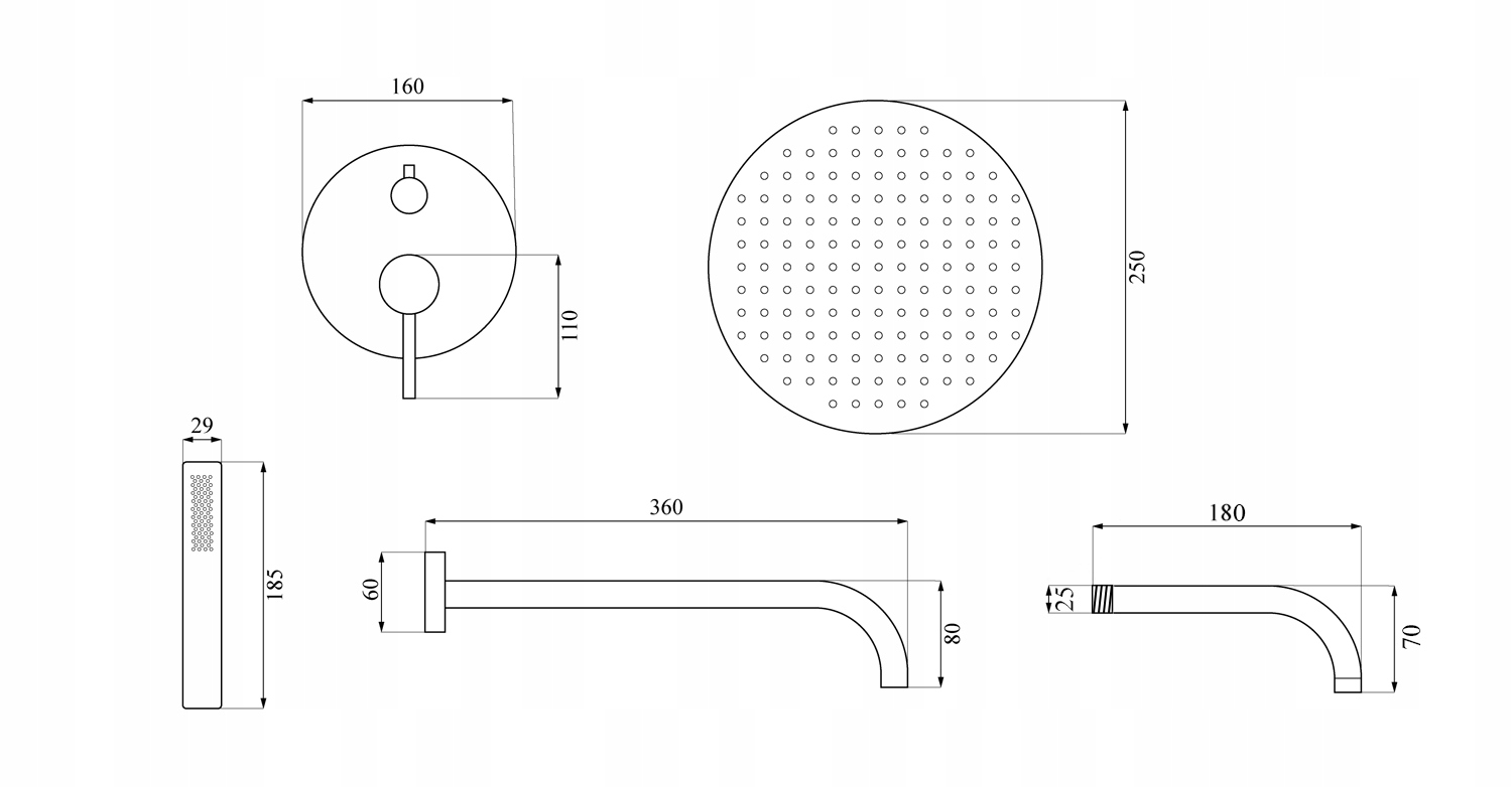 - Дощова головка: Тонкий 250x250 мм