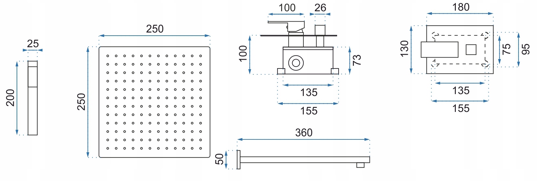 У набір входить надтонкий квадратний тропічний душ 2 мм, 25 см, змішувач з накладними та прихованими елементами, шланг з трубкою та набором точок.