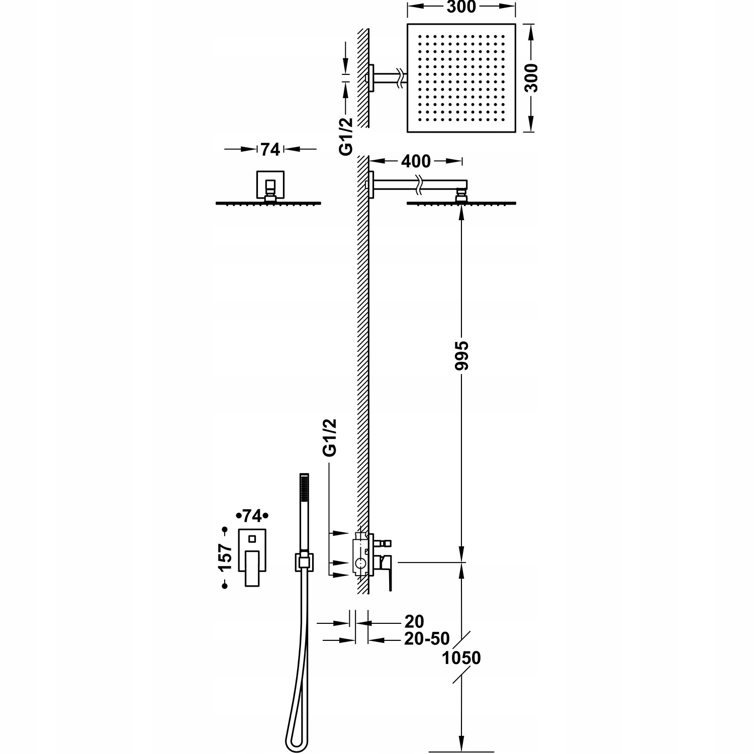 Прихований корпус у комплекті.· Двосторонній перемикач струменю.· Настінний кронштейн із регульованим тропічним душем з нержавіючої сталі: 300x300 мм.· Тримач душової лійки з підключенням до стіни.· Душова лійка з латунною системою проти накипу.· Сатиновий шланг.