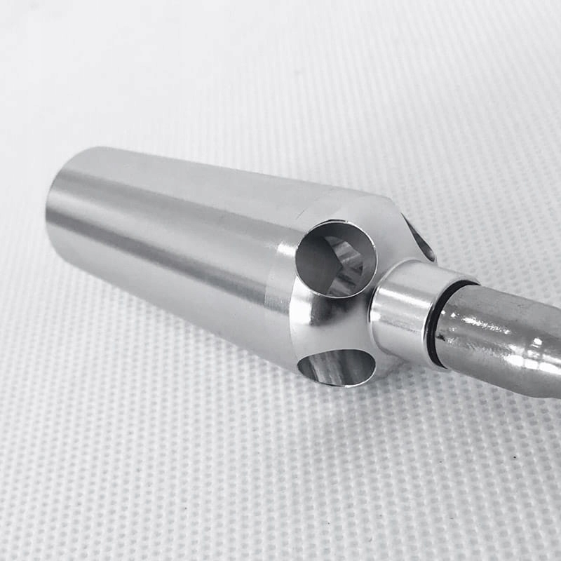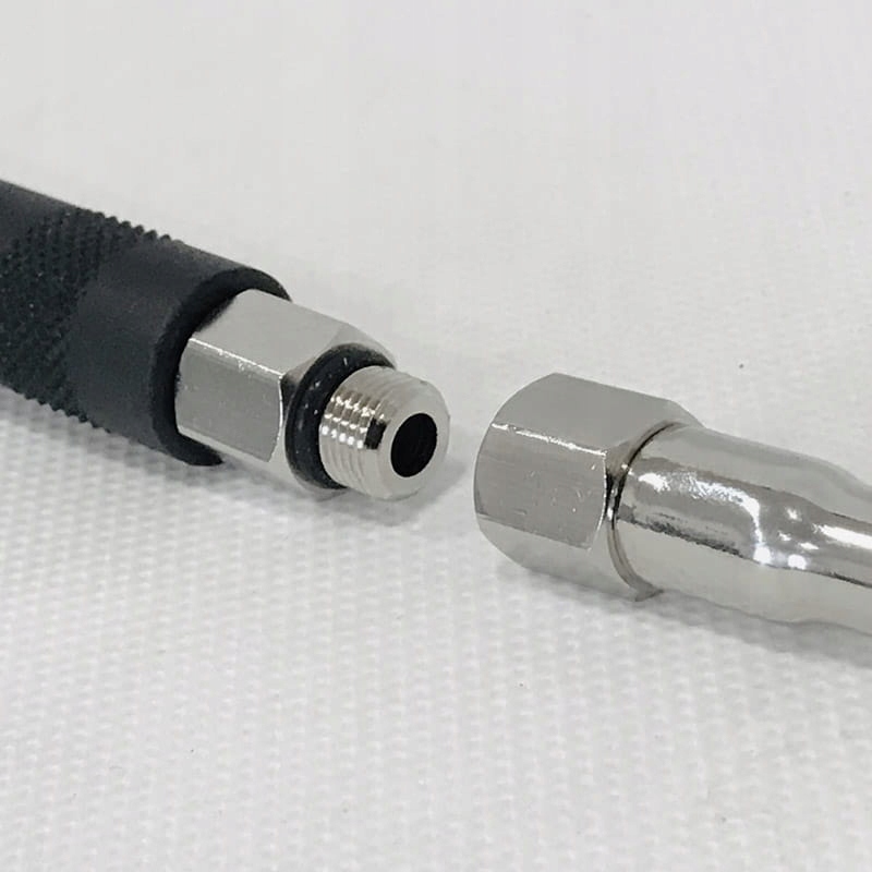 Подувний пістолет складається з двох секцій, з’єднаних гвинтами (різьба 1/8 дюйма – фото 4 і 5) довжиною 98 см і 91 см. Загальна довжина, включно з рукояткою, становить 2 м. Рукоятка покрита матеріалом, який усуває «холодний дотик».