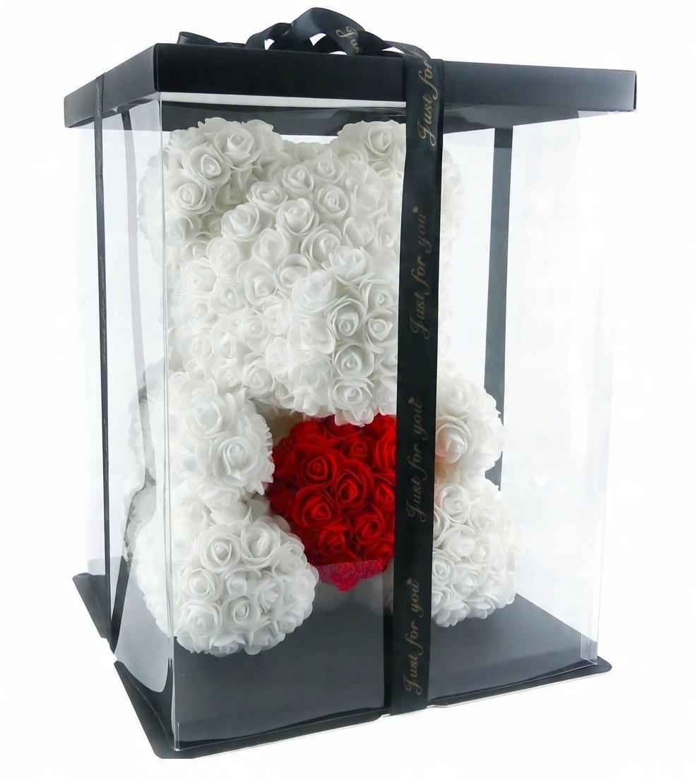 ⭐ Наш ведмедик упакований в декоративну ПВХ коробку, яка зібрана. Товар вже перев'язаний чорною стрічкою, тому після замовлення подарунка Вам не потрібно нічого робити - просто подаруйте коханій людині!