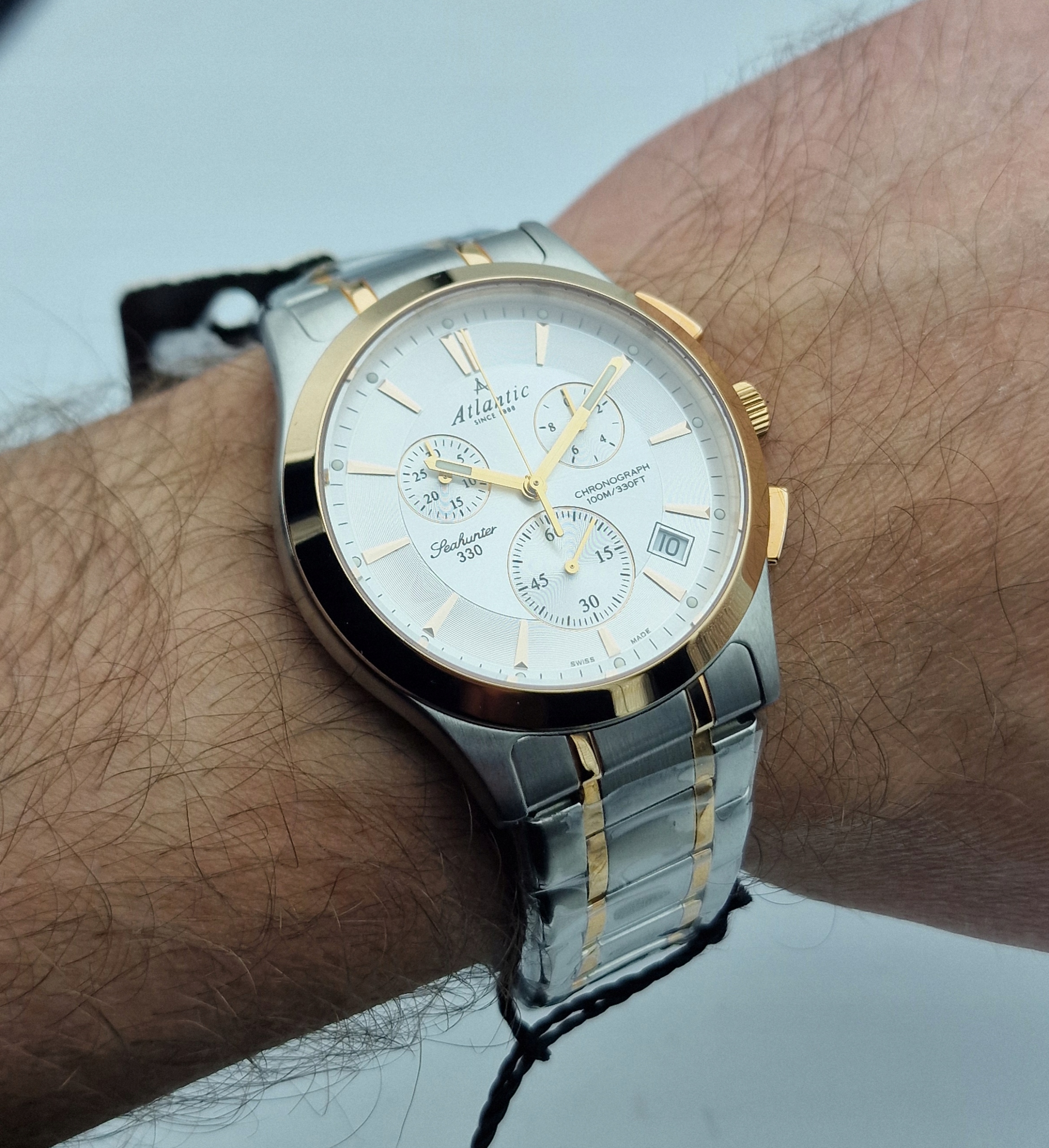 Цього разу у мене є наручний годинник для знавців і ентузіастів. Це класична модель годинника ATLANTIC SEAHUNTER 330 CHRONOGRAPH в сталевому корпусі з золотими вставками. Годинник ходить добре і пунктуально. У заводському стані...