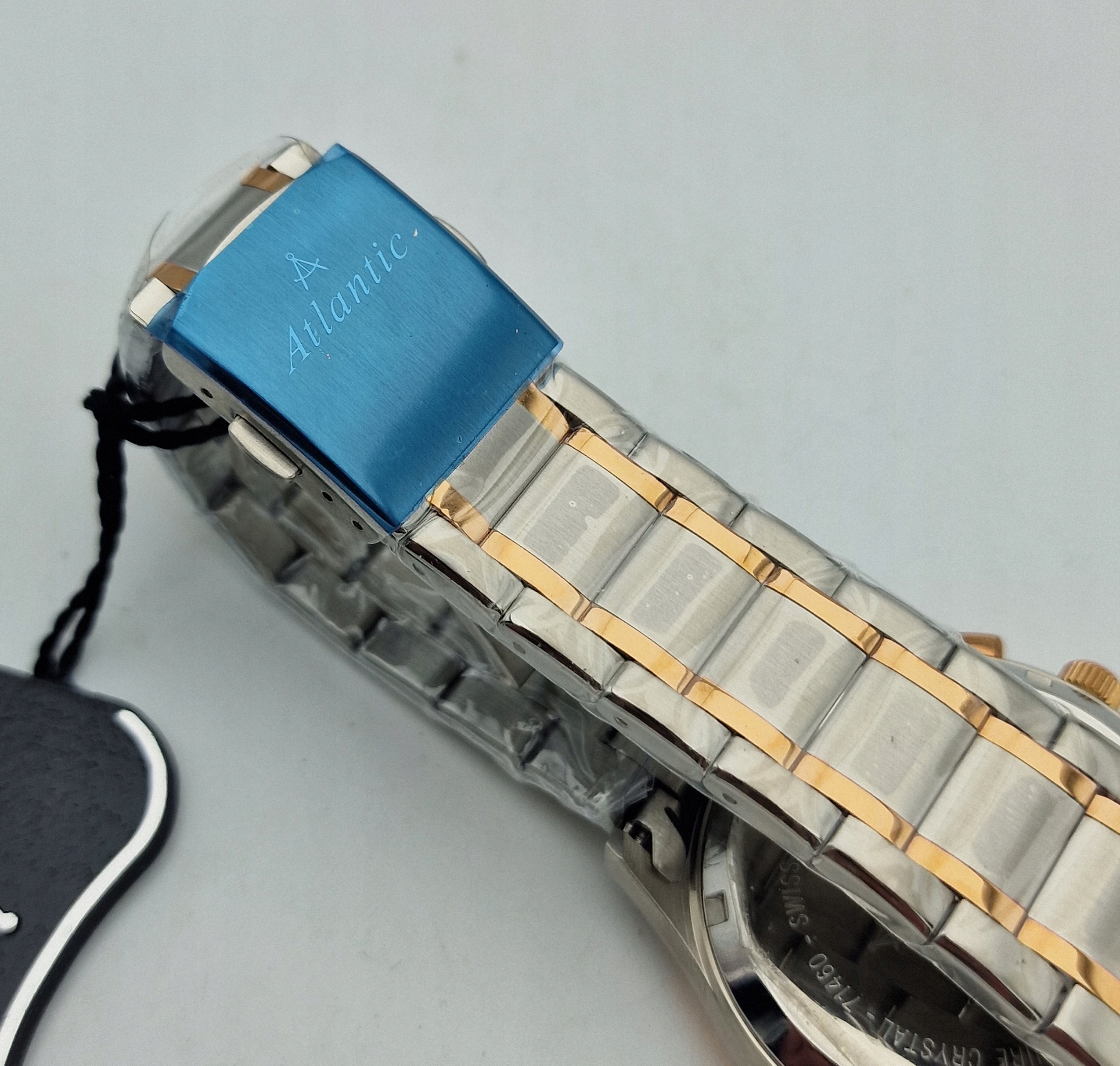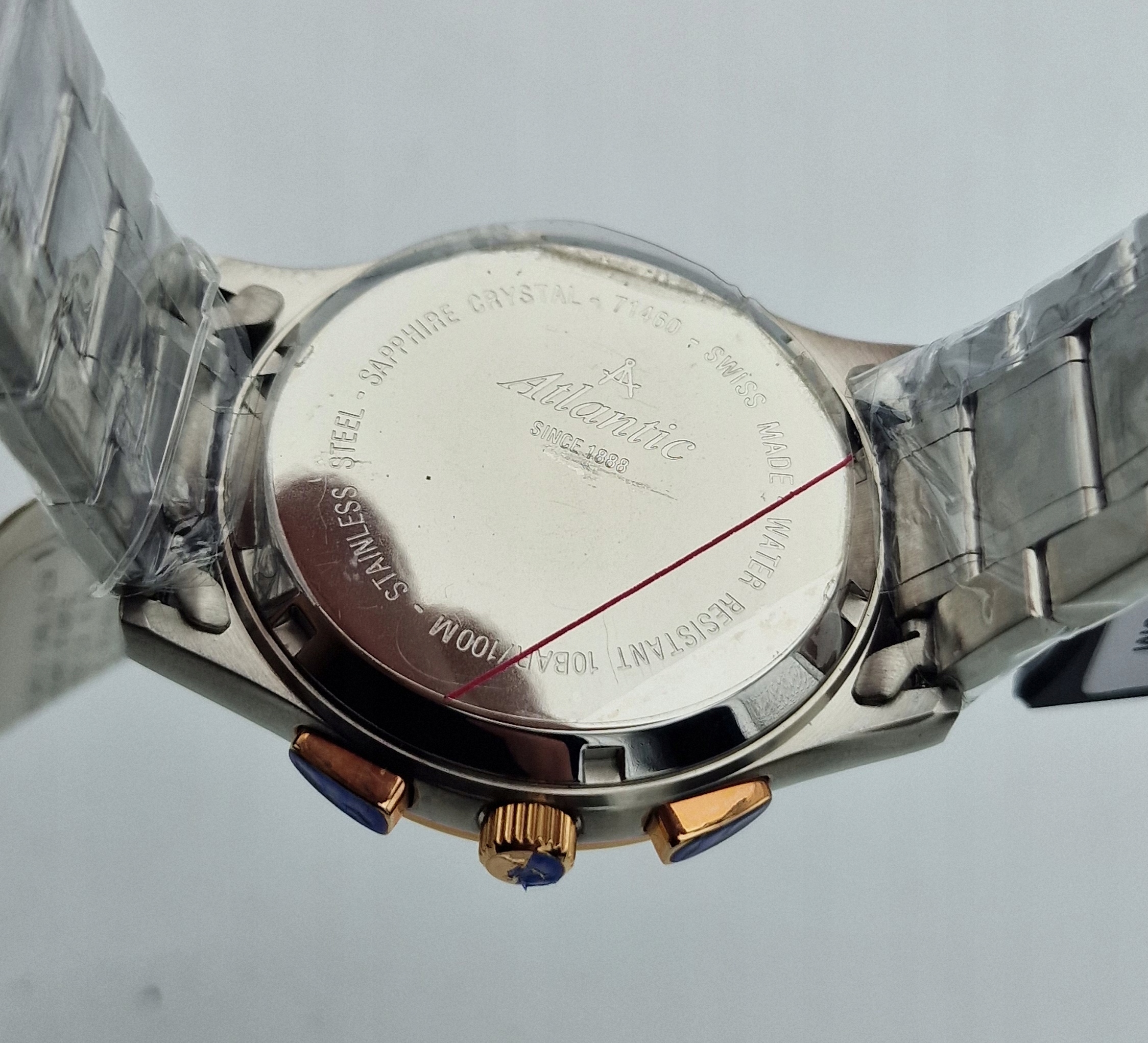 - Сталевий корпус із позолоченими вставками, загвинчувана задня кришка, підпис: «НЕРЖАВІЮЧА СТАЛЬ, ВОДОСТІЙКІСТЬ 10 БАР/100 М, САПФІРОВЕ КРИСТАЛ, 71460, ВИРОБНИЦТВО В ШВЕЙЦІЇ, АТЛАНТИКА З 1888 РОКУ». Оригінальне мереживо в ідеальному стані. Конверт в ідеальному стані, як на фото.
