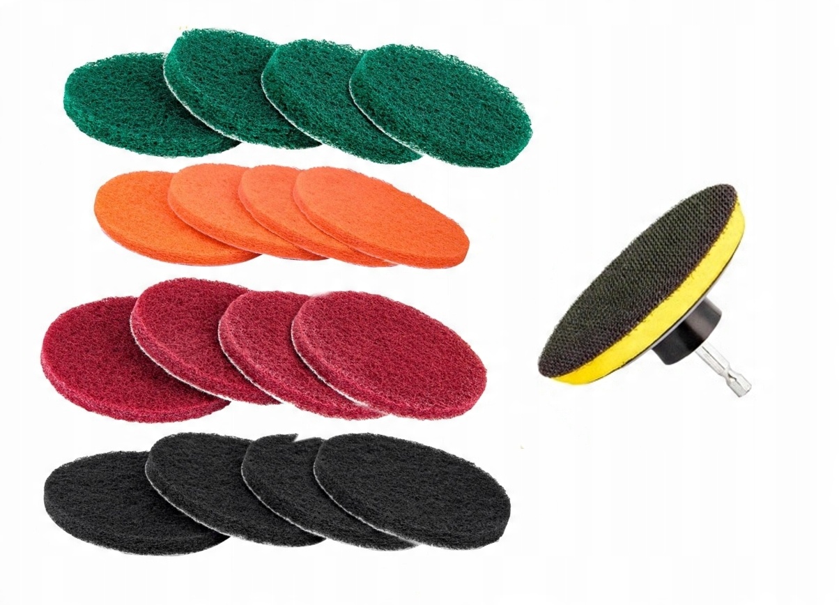 Набір із 6 щіток і 14 абразивних і полірувальних подушечок з насадкою для дрилі або викрутки та набором аксесуарів.