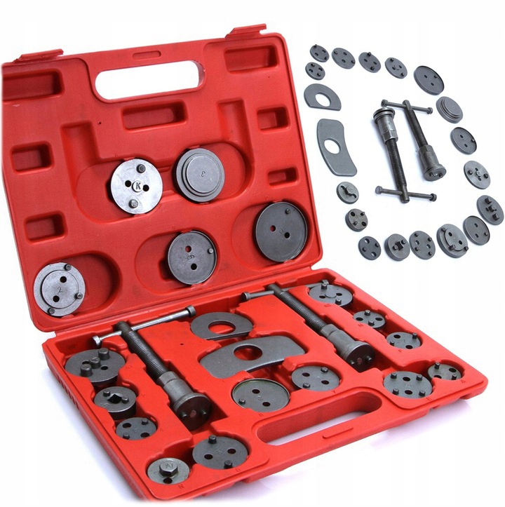 Набір включає 19 адаптерів, адаптованих до розміру поршнів 2 правих і лівих гальмівних пресів, які використовуються в більшості легкових автомобілів, вироблених на європейському та азіатському ринках: