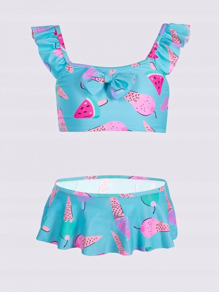 Гарний купальник для дівчинки з двох частин з мотивом смачного морозива. Спереду на бюстгальтері є декоративний бант. Регульований ремінь дозволяє індивідуально налаштувати костюм відповідно до ваших потреб. Трусики прикрашені чарівним воланом, що імітує спідницю.
