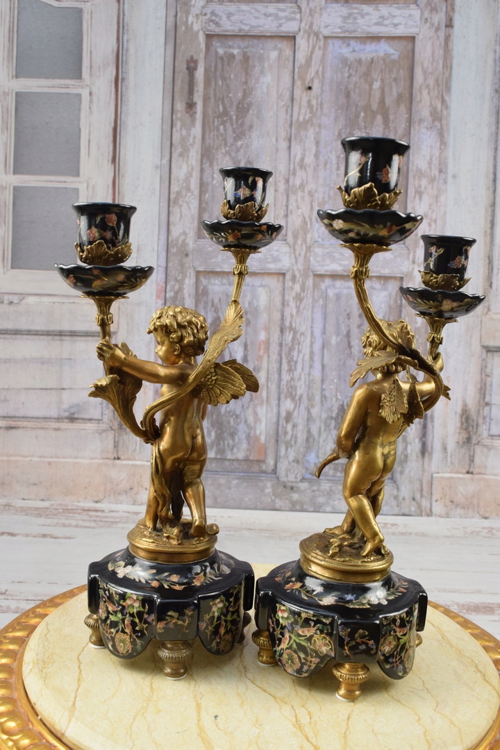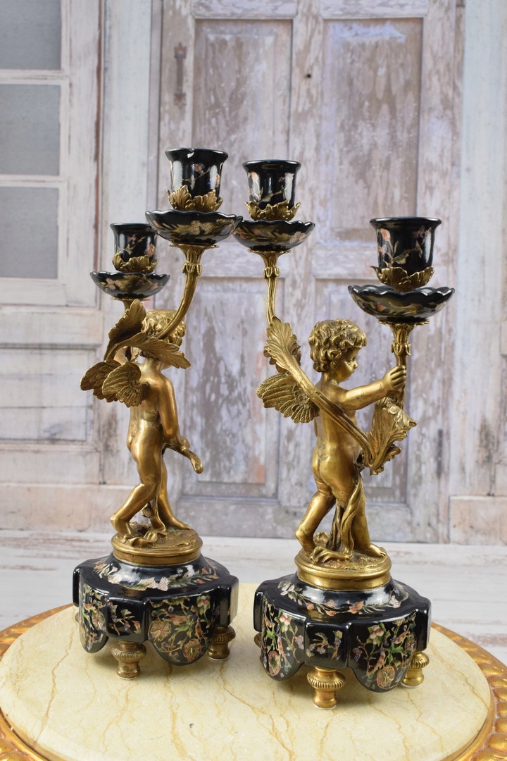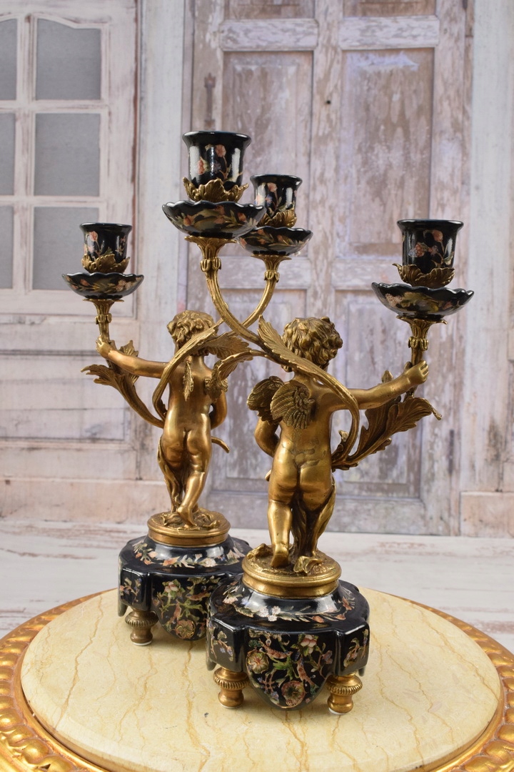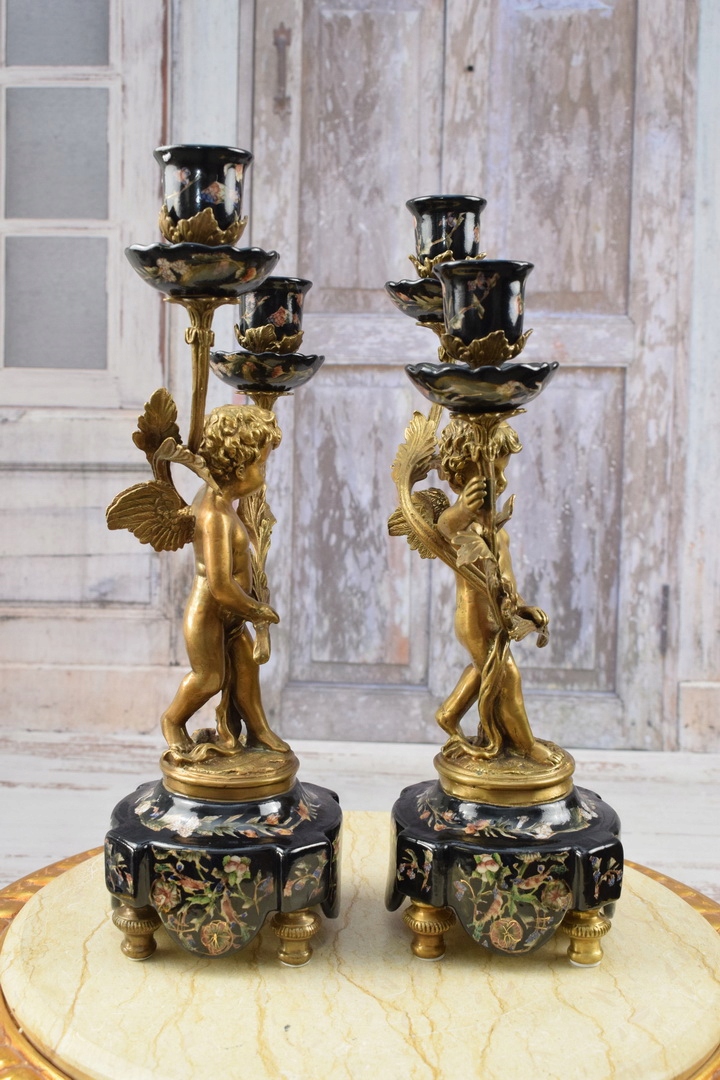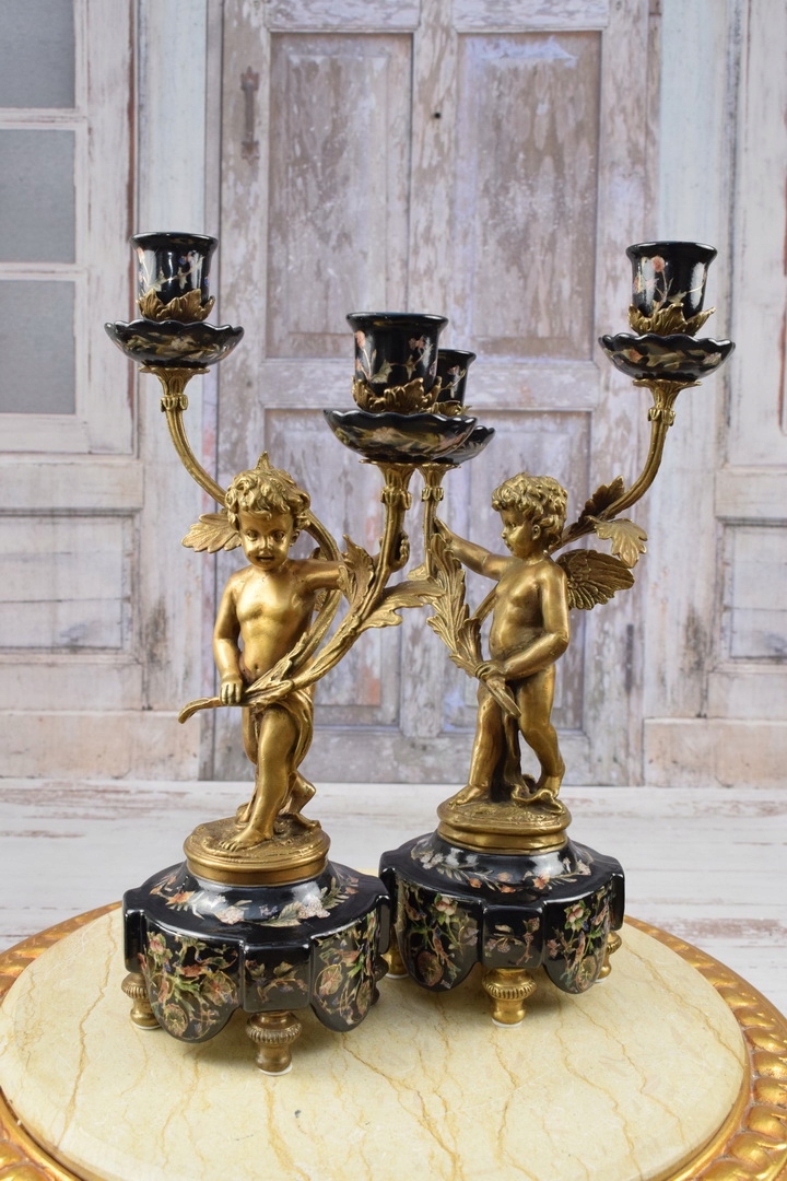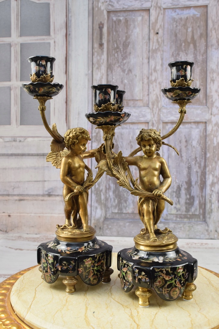 Два чорних свічника - порцеляна + бронзова фігура - фігурки ангелів Аморі