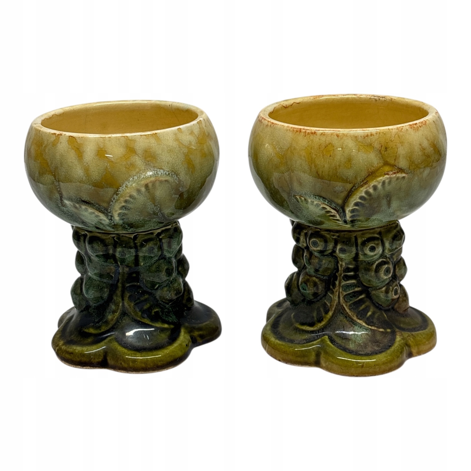 Дві керамічні келихи, висота 12 см, діаметр чаші 8 см. Тріщини на емалі, характерні для кераміки.