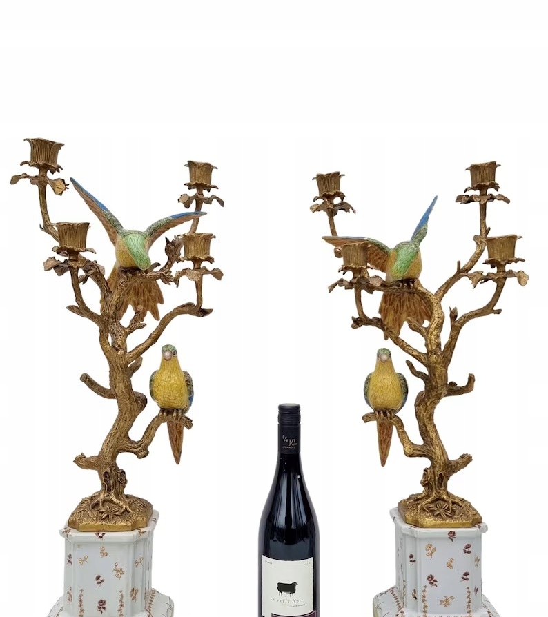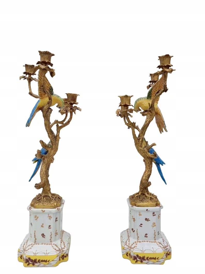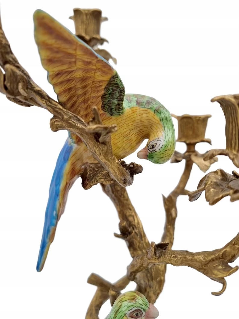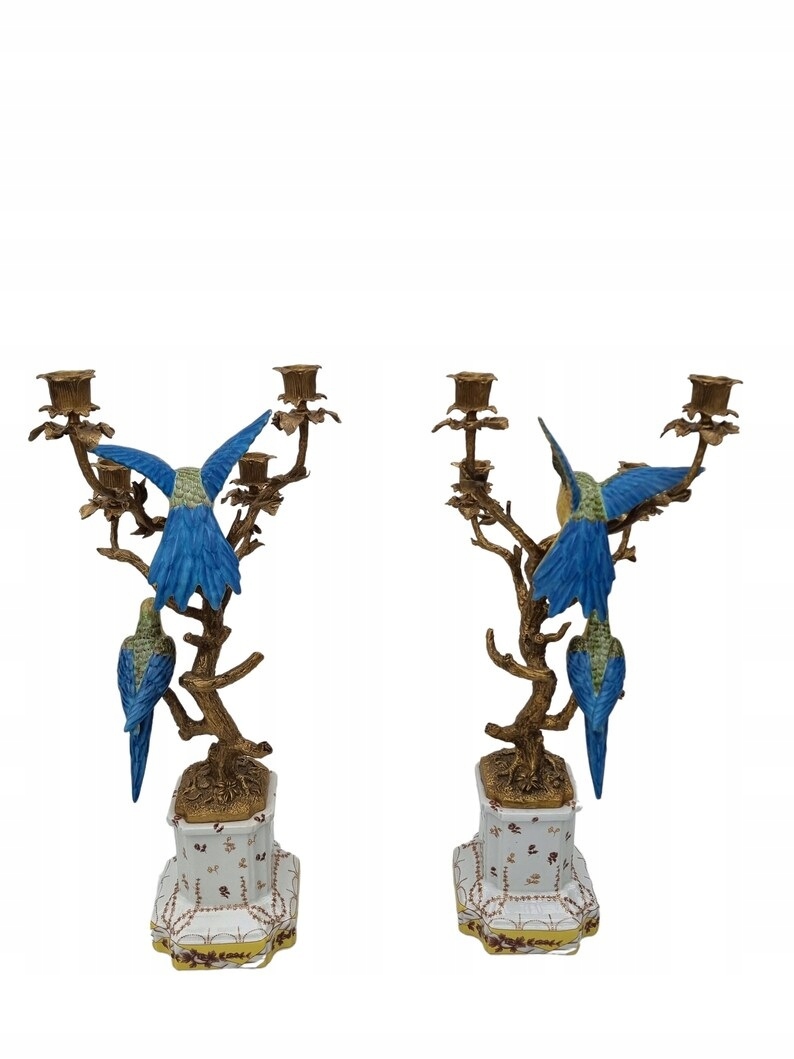 Два свічники - порцеляна + бронза - арт-деко - папуги-канарки на гілці