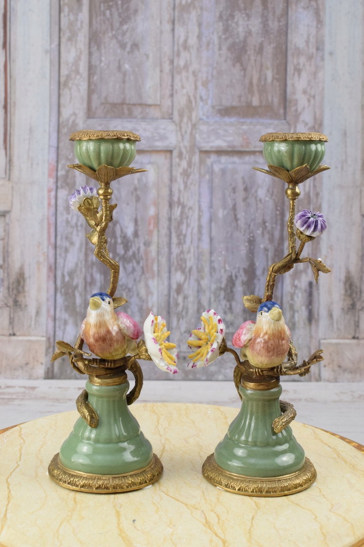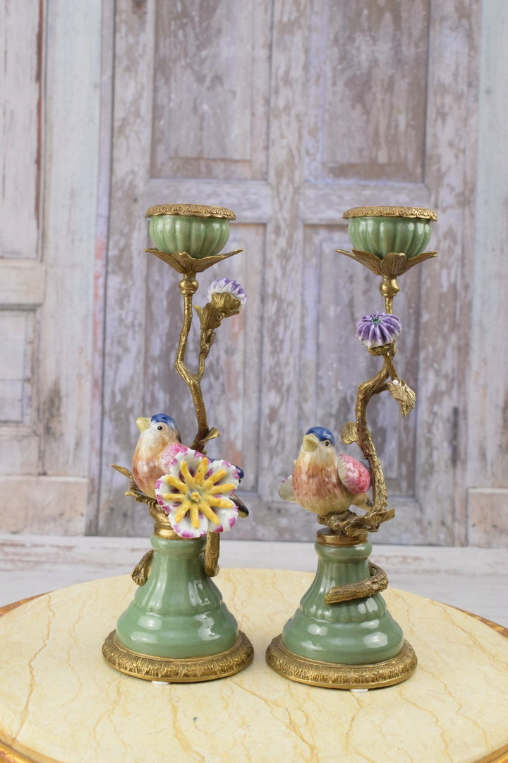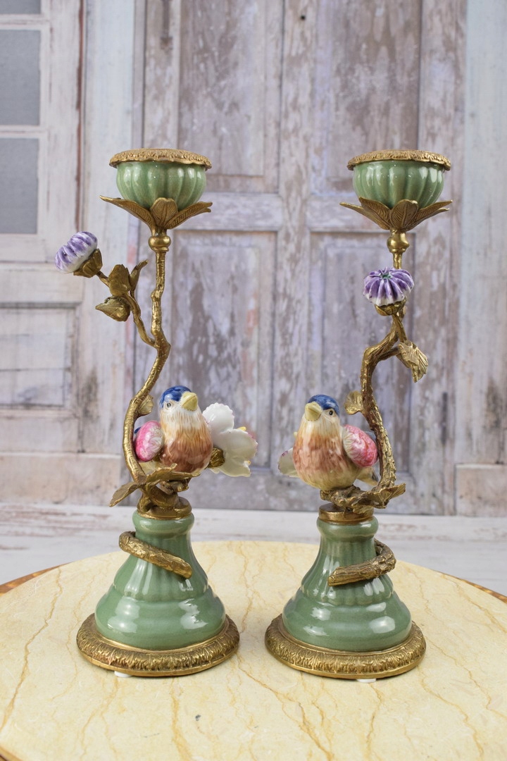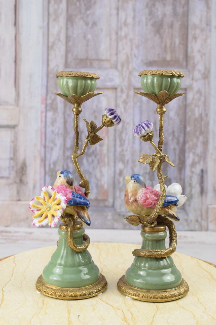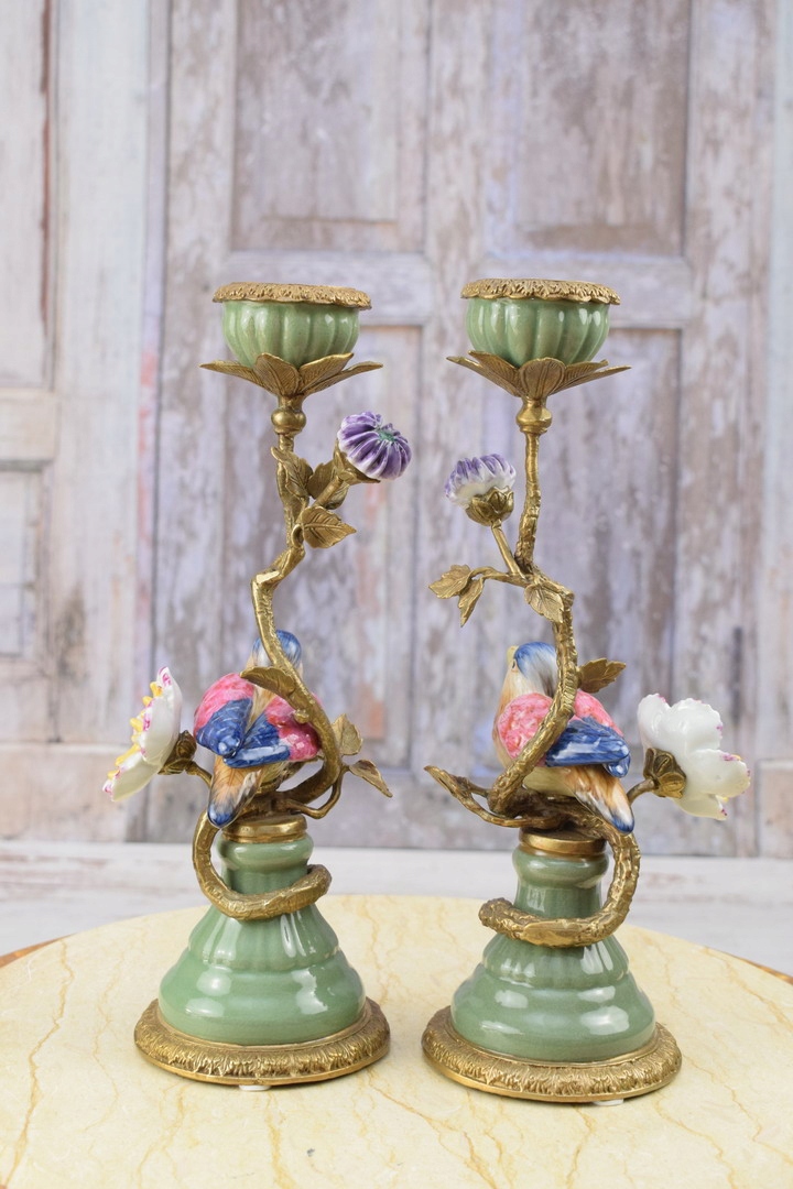 Два зелених підсвічника - порцеляна + бронзова фігурка - Пташки 2 шт.
