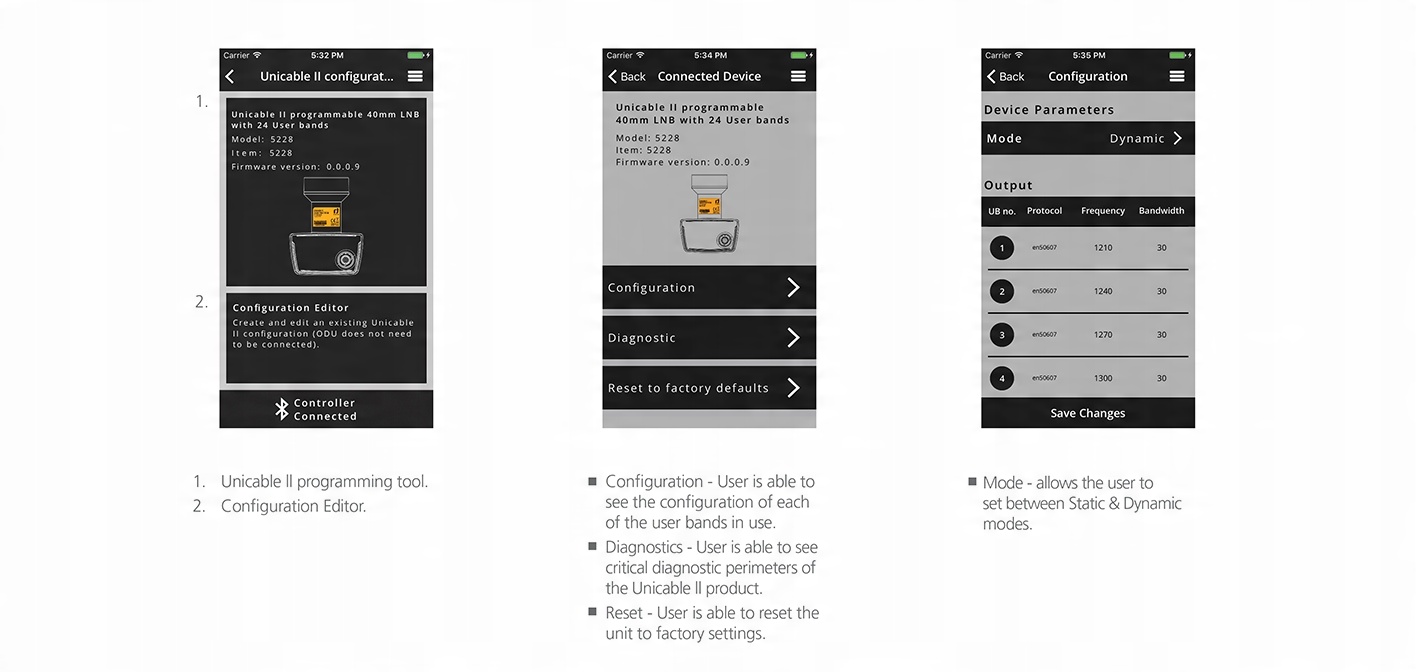 Контролер SatPal ™ також можна використовувати як програматор для конвертера Invertos Unicable II ™ і мультисвічів. Програма SatPal™ дозволяє інсталятору створювати конфігураційні файли та завантажувати їх на пристрої, наприклад, під час зміни транспондера оператора або встановлення MDU за допомогою dCSS LNB, що працюють у статичному режимі. Файли конфігурації можна зберігати локально, на вашому смартфоні, у хмарі або в пам’яті контролера SatPal™, щоб передавати їх безпосередньо одним натисканням кнопки. Додаток також дозволяє оновлювати прошивку та отримувати доступ до діагностичної інформації, що зберігається на пристроях Unicable II™. Все це зібрано в невеликому зручному інструменті, який також недорогий. Рішення SatPal ™ гарантує більш високу ефективність і значне зниження витрат на обслуговування.