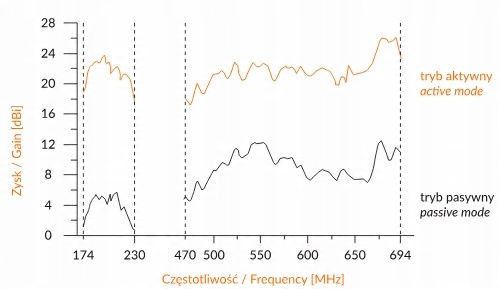 Діаграма поруч із нею показує характеристики прибутку антени як частотної функції. У чорному (буква P) прибуток антени в пасивному режимі помаранчевий колір (буква A) був позначений характеристиками в активному режимі з урахуванням посилення підсилювача. Інсталятор, який збирає дипол антени Smart, не повинен турбуватися про тестування різних версій антен, замінивши симетризатор на підсилювач або навпаки. Все, що вам потрібно зробити, - це повернути 12 В напруги на лічильнику на етапі встановлення та вимірювання сигналу, щоб перевірити параметри сигналу в обох режимах антени та вибрати більш відповідний. Для безперервної роботи в активному режимі слід використовувати джерело живлення постійного струму 12 V 100 мА.