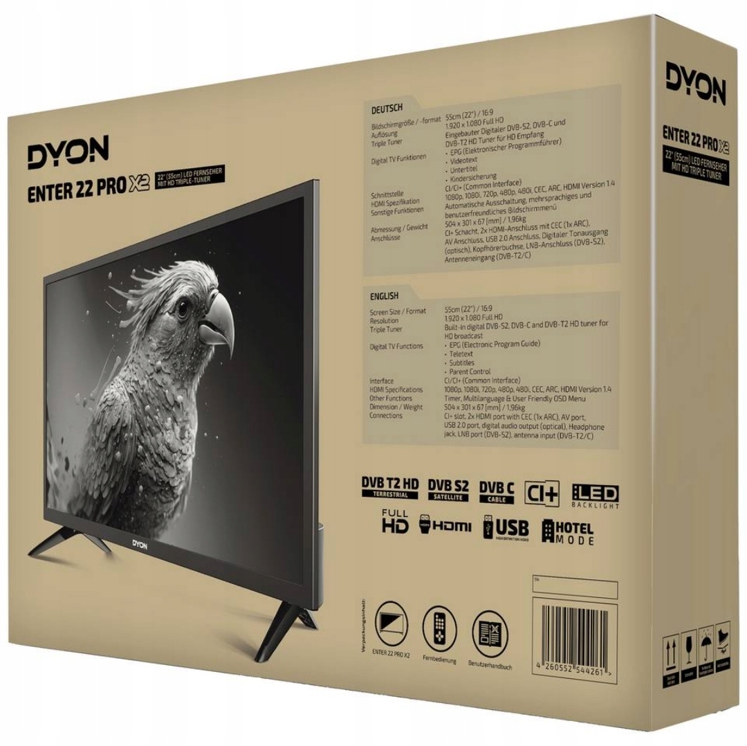 Dyon Enter Pro X2 поєднує компактну конструкцію, вдосконалену технологію та продуктивність. Інтуїтивна зручність використання та прозора навігація в меню є характерною особливістю серії Dyon Enter Pro X2. Чудові кольори та зображення бритви -сарп -результат найсучаснішої світлодіодної технології. Вбудований потрійний тюнер HD дозволяє збирати антену (DVB-T2), а також якість HD за супутниковим (DVB-S2) та кабелем (DVB-C). Серія Dyon Enter Pro X2 має інтерфейс CI+ для отримання платних телевізійних програм, що економить додаткові витрати на додатковий приймач. Режим готелю дозволяє зберігати програми та блокувати різні налаштування пристрою. Ви можете легко відтворювати фільми, музику чи фільми з USB -пам'яті або жорсткого диска USB за допомогою інтегрованого USB -мультимедійного програвача.
