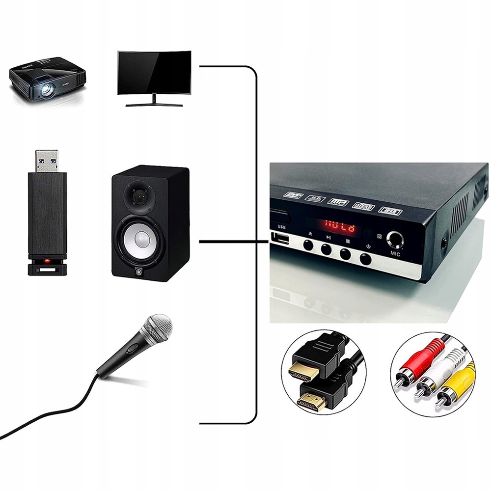 💿💿- Вбудований подвійний роз’єм для мікрофона, підтримує мікрофон для караоке, також підтримує систему сигналів PAL/NTSC.