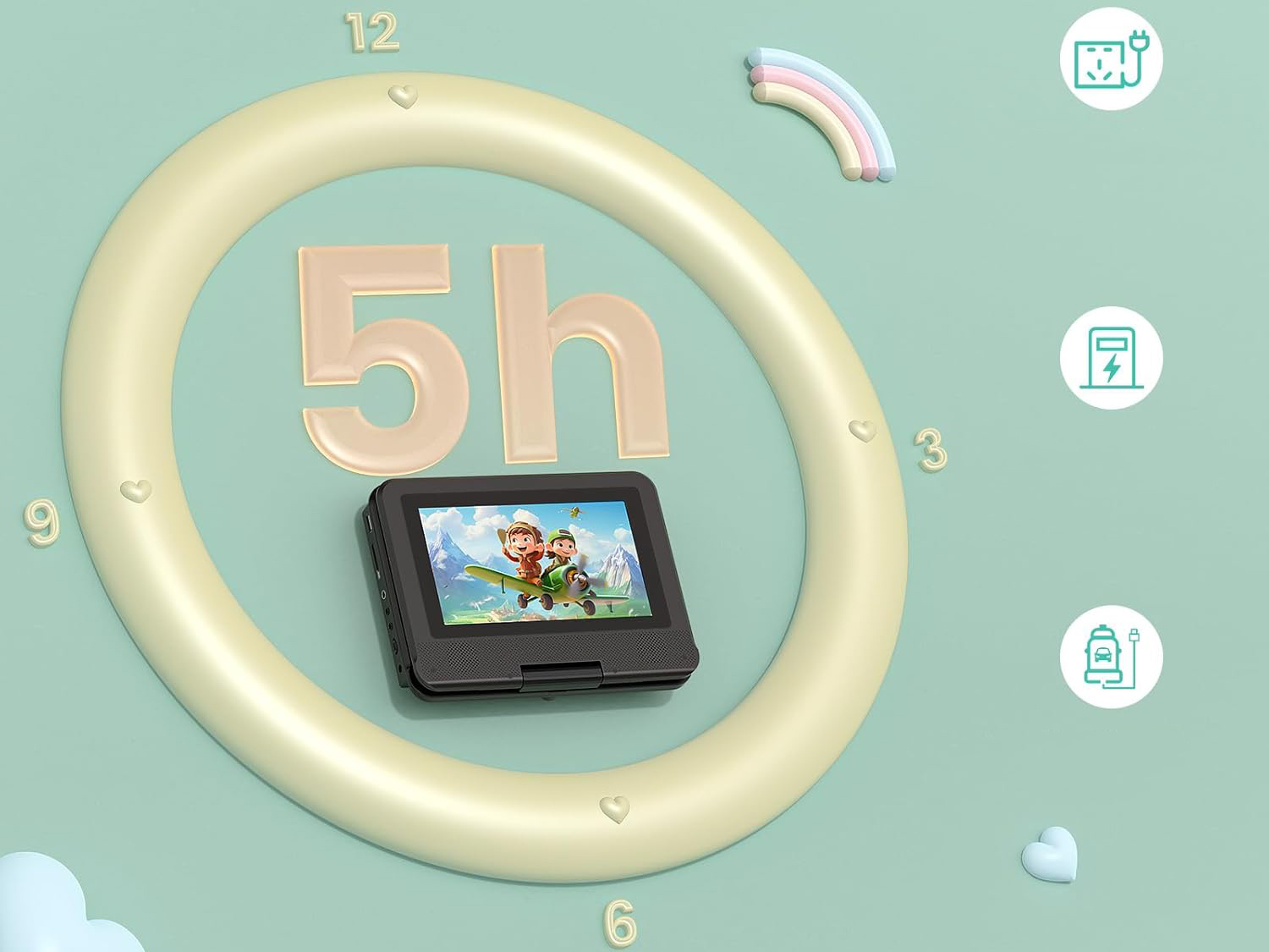 Наш портативний DVD-програвач оснащений довготривалим акумулятором ємністю 2500 мАг, який у повністю зарядженому стані забезпечує приблизно 4-6 годин роботи, чого достатньо для перегляду 2-3 фільмів без перерви. Завдяки сертифікованому високоякісному автомобільному зарядному пристрою ви можете безпечно використовувати його під час подорожей.