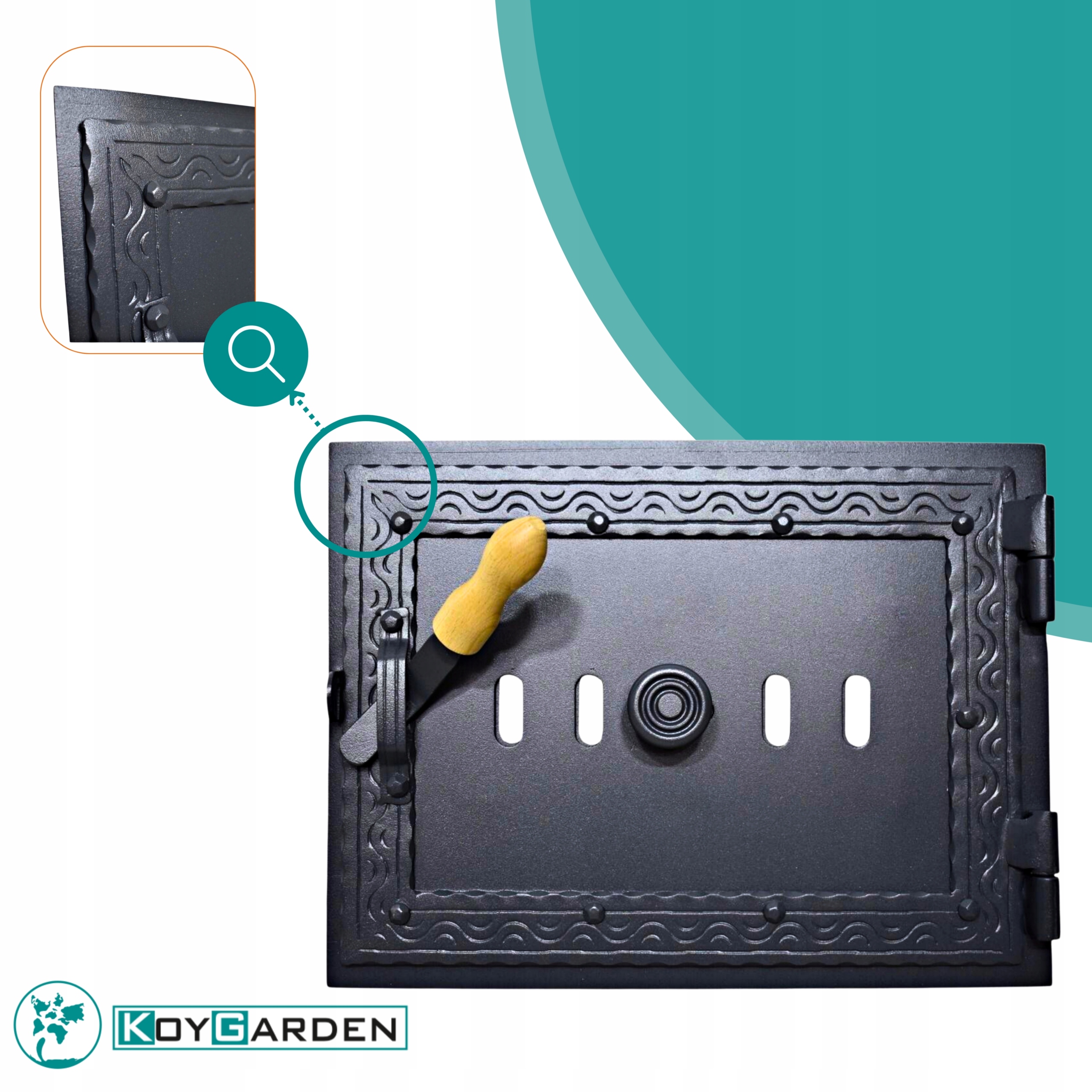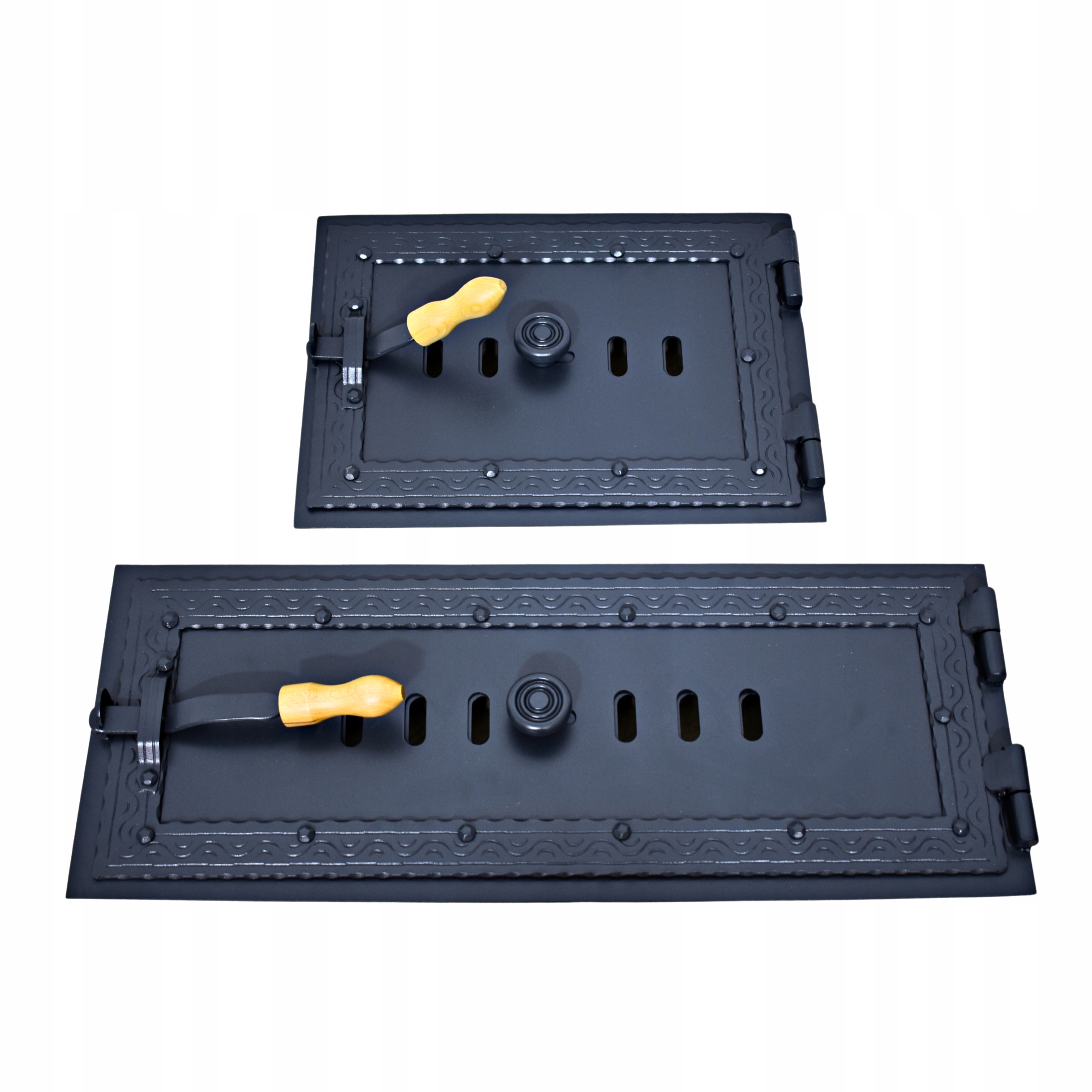 Дверцята повністю виготовлені зі сталі товщиною 2 мм, встановлені на міцну раму. Вони покриті термостійкою фарбою RAL 7016 - антрацит, що надає їм сучасний вигляд і ефективно захищає від високих температур і корозії.