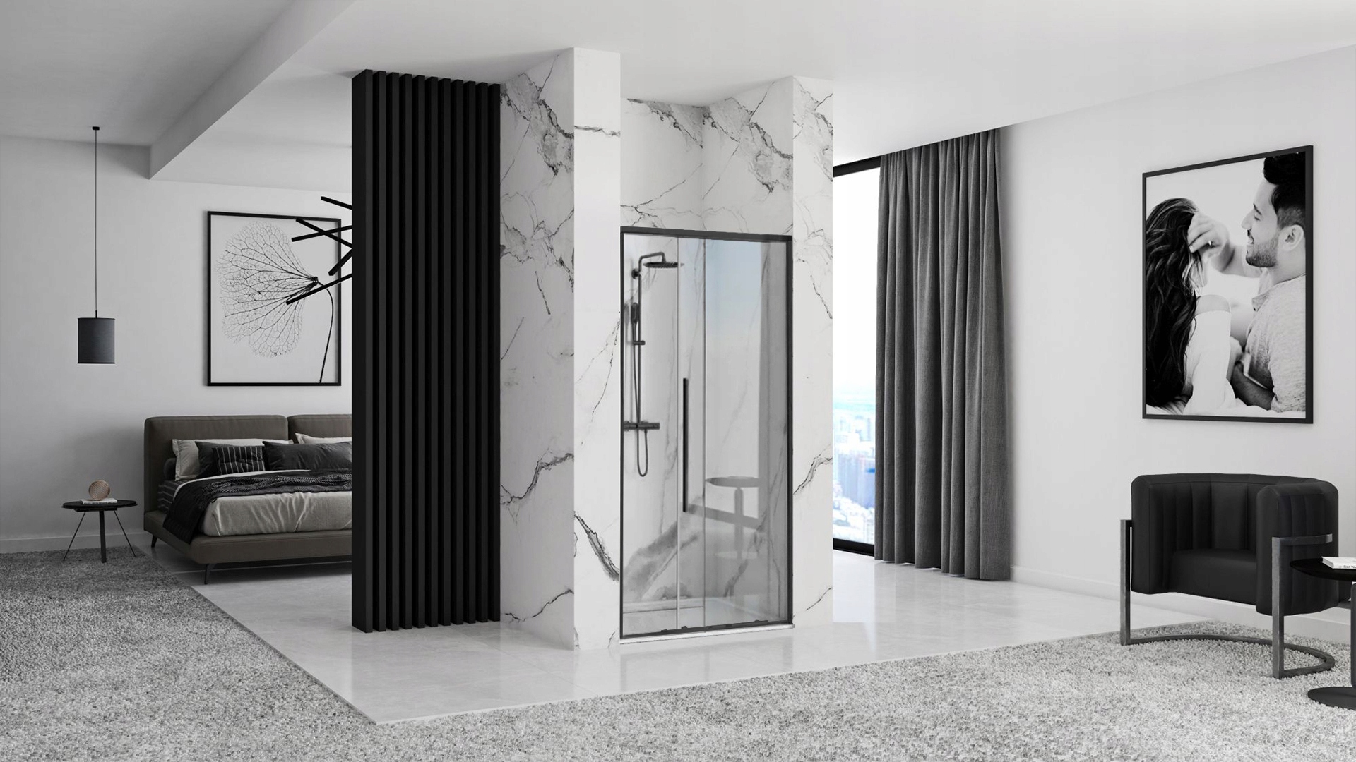 Сонячні двері мають універсальні профілі, які дозволяють регулювати та легко налаштуватись на різні типи установок. Чорний колір обробки дає їм сучасний персонаж, який добре поєднується як із сучасним, так і з класичним інтер’єром. Ванні кімнати.