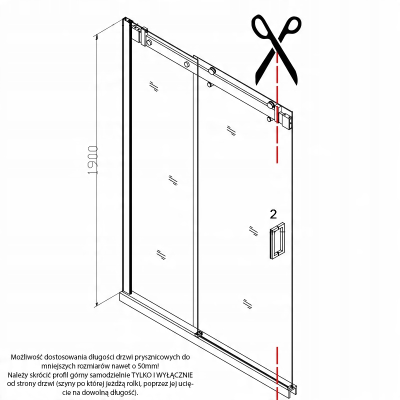 Можливість регулювати довжину душових дверей до менших розмірів до 50 мм! Самостійно вкоротіть верхній профіль ТІЛЬКИ І ТІЛЬКИ з боку дверей (рейку, по якій ходять ролики, обрізавши на будь-яку довжину).