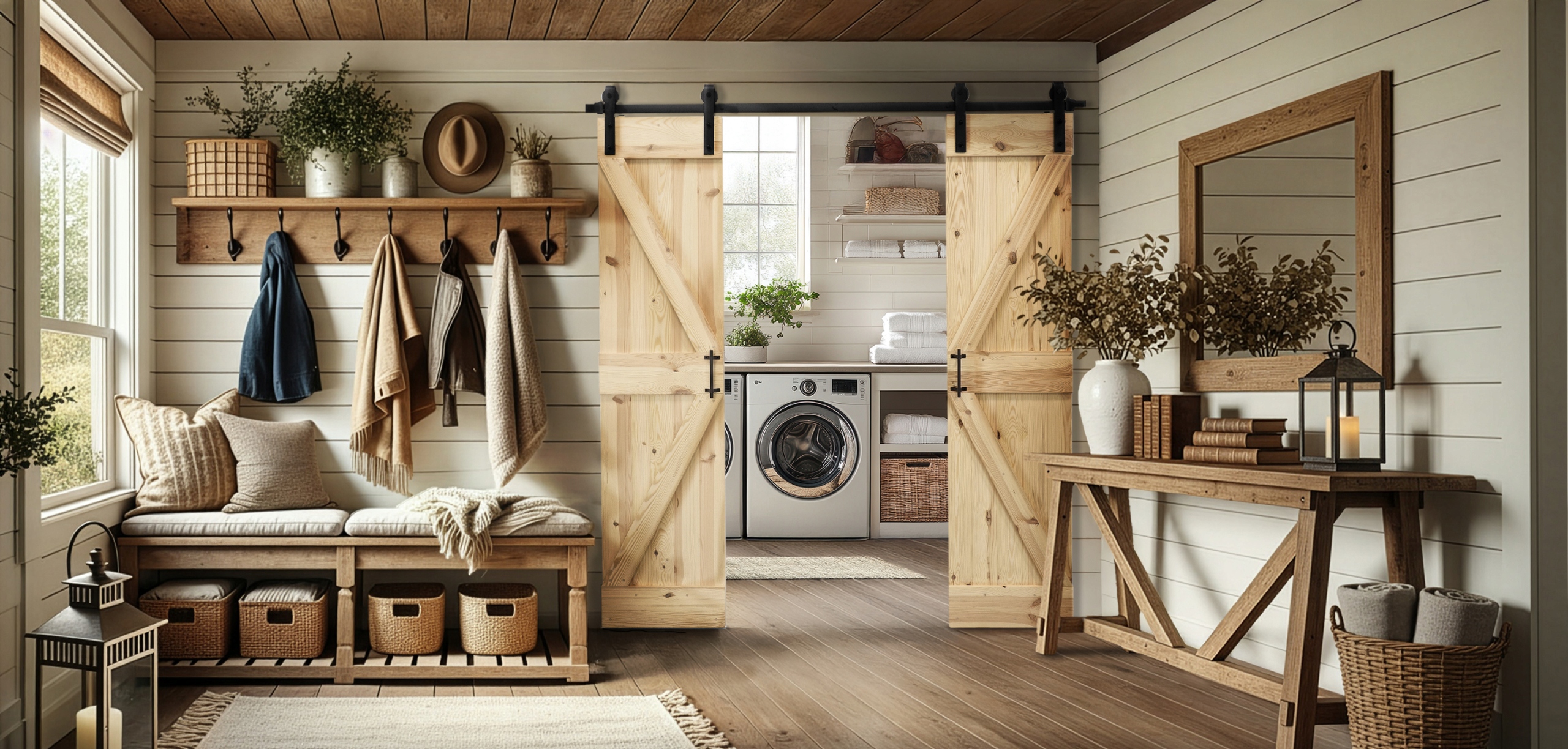 Лісові двері – це поєднання природної краси дерева та функціонального дизайну. Виготовлені з масиву сосни, вони відрізняються чіткими зернистими візерунками, сучками і теплим відтінком, який привносить в інтер'єр затишну, сільську атмосферу. Конструкція кожної стулки складається з вертикально розташованих дощок, укріплених поперечною планкою та діагональним стрілоподібним елементом, що надає дверям характерного стилю амбарних дверей. Набір складається з двох стулок, що створює ефектну та практичну ширму.
