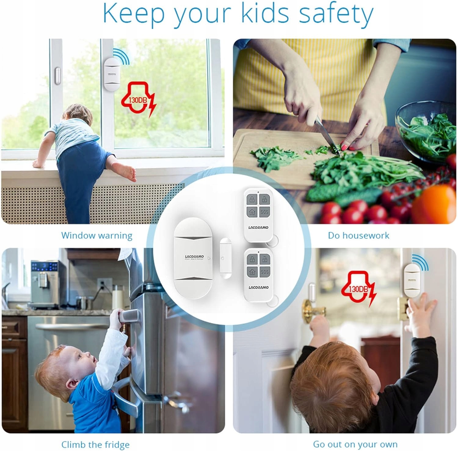 - Гучний сигнал тривоги 130 дБ нагадатиме вам про вашу та вашу сім'ю, що хтось увійде в будинок або вийде з дому. Бездротова тривога Lacoramo допомагає покращити безпеку будинку та дітей, захищає спальні, квартири, офіси, медичні шафи, вікна, ящики, двері басейну, розсувні двері, холодильники тощо