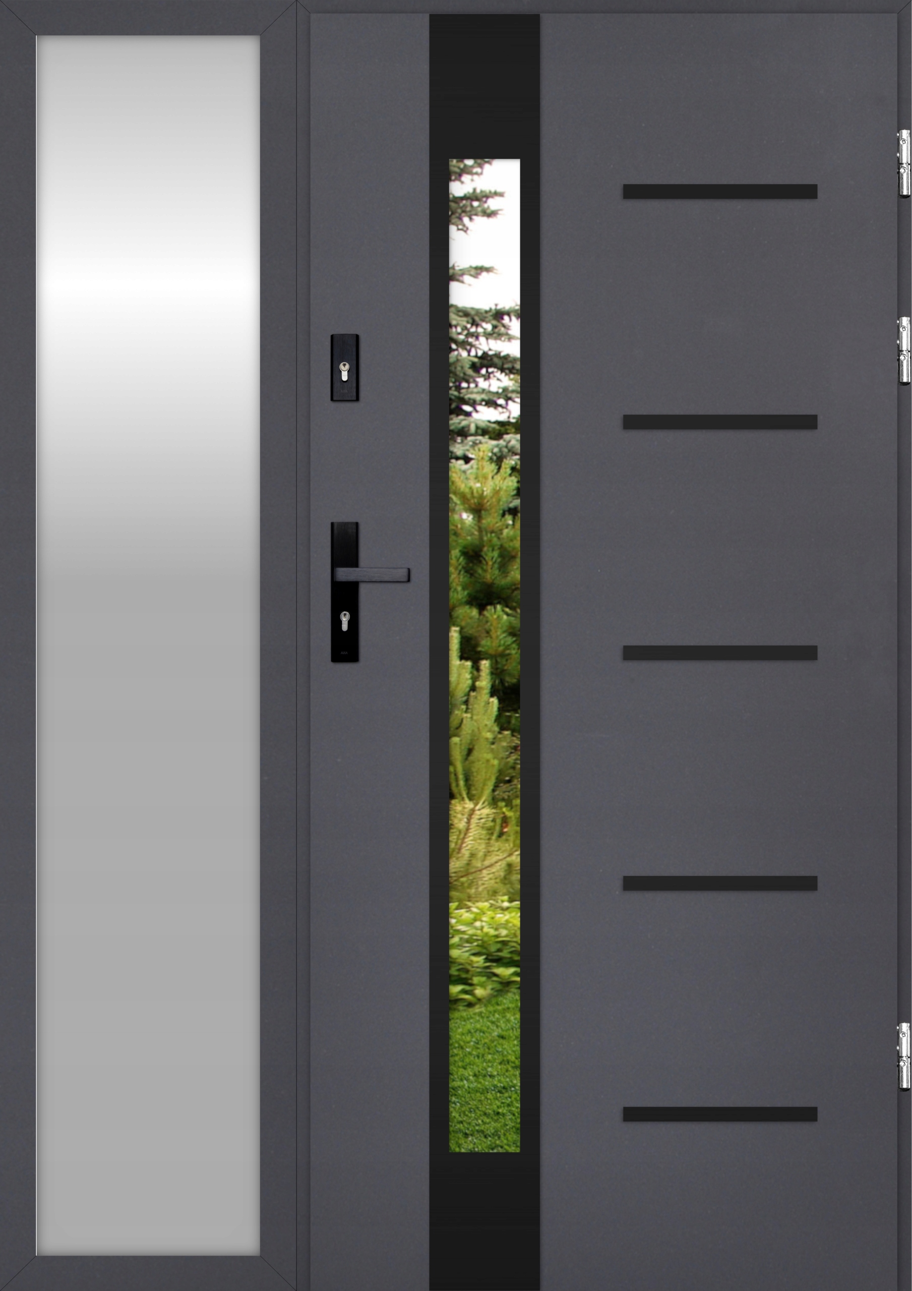Модель вхідних дверей, присвячена енергетичній конструкції. Крило товщиною 73 мм було заповнене графітовим пінопластовим полістироном. Теплово -рамка, поєднавши з порогом алюмінію рото, тепловим прокладтером та чотирма -розрізненим клеєм, забезпечує енергоефективність на найвищому рівні. Зовнішні двері оснащені трьома 3D -петлями діаметром 20 мм, які характеризуються здатністю переносити важкі навантаження, що значно збільшує функціональність та комфорт використання. Вхідна структура, оснащена таким шарніром, не є тенденцією до падіння. Крім того, петлі дозволяють регулювати на три рівні, що забезпечує симетрію положення крила відносно рами (вгору/вниз і ліворуч/праворуч), а також відповідний тиск крила до рами (третя площина регулювання). Два незалежні замки з трьома шпильками та трьома антитемнісними штифтами забезпечують високий ступінь резистентності.