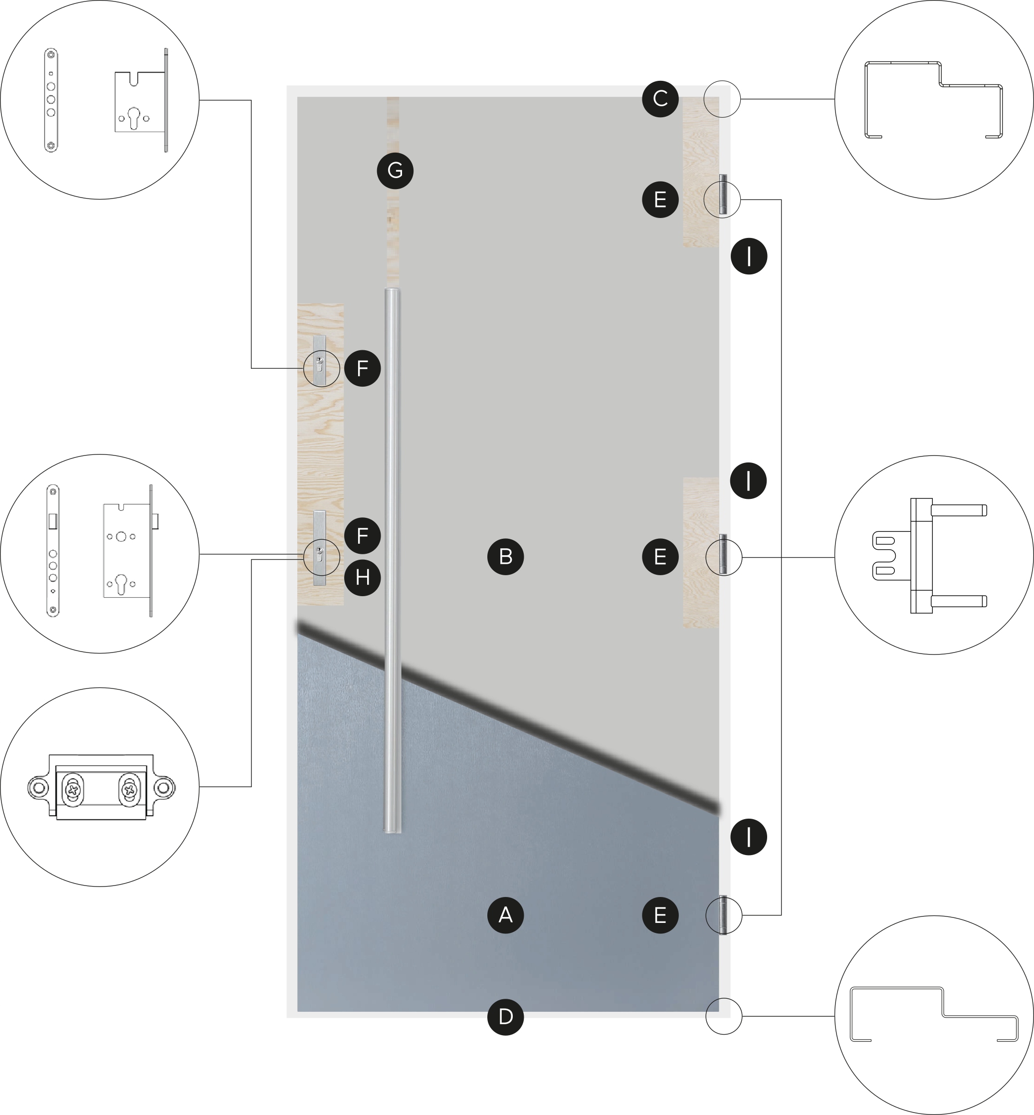 Усі наші поручні кріпляться до спеціальної підсилення рами з водонепроникної фанери, а не до голого металевого листа. Зверніть увагу, що таким чином ручка стабільно та надійно закріплена. Завдяки цьому кріпильні гвинти з внутрішньої сторони дверей не видно, як у випадку з ручками, встановленими через двері. Таке кріплення поручнів є стабільним, не викликає деформації листової пластини, а візуальний ефект набагато сприятливіший.