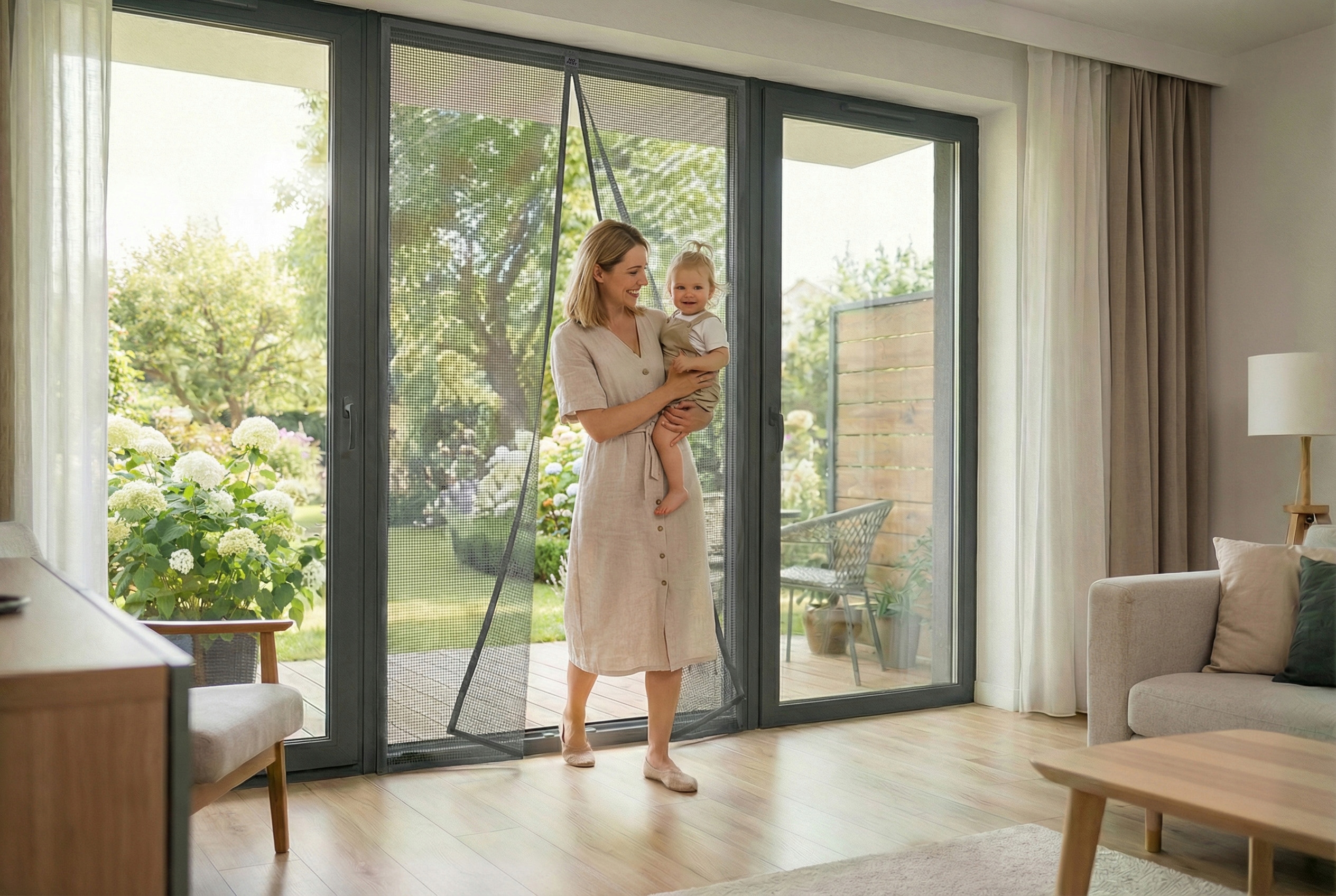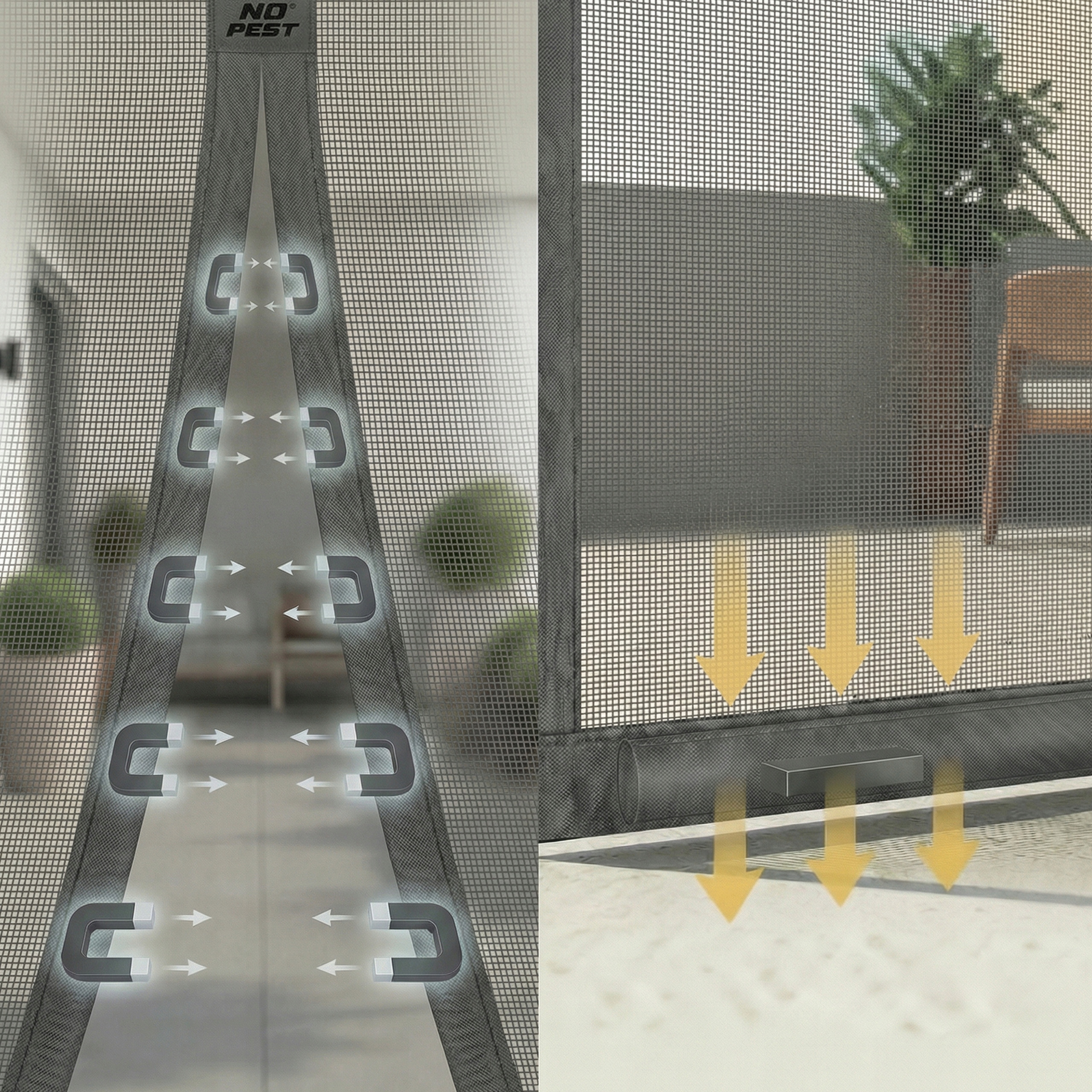 Москітна сітка Silent Screen No Pest® оснащена 16 парами міцних магнітів, повністю вшитими в сітчасту структуру, завдяки чому вони залишаються невидимими та естетичними. Таке розташування позбавляє від виступаючих елементів і забезпечує ідеальне зчеплення стулок по всій висоті. Додаткові менші ваги стабілізують сітку та підтримують її автоматичне закривання, запобігаючи її підйому та утворенню щілин.