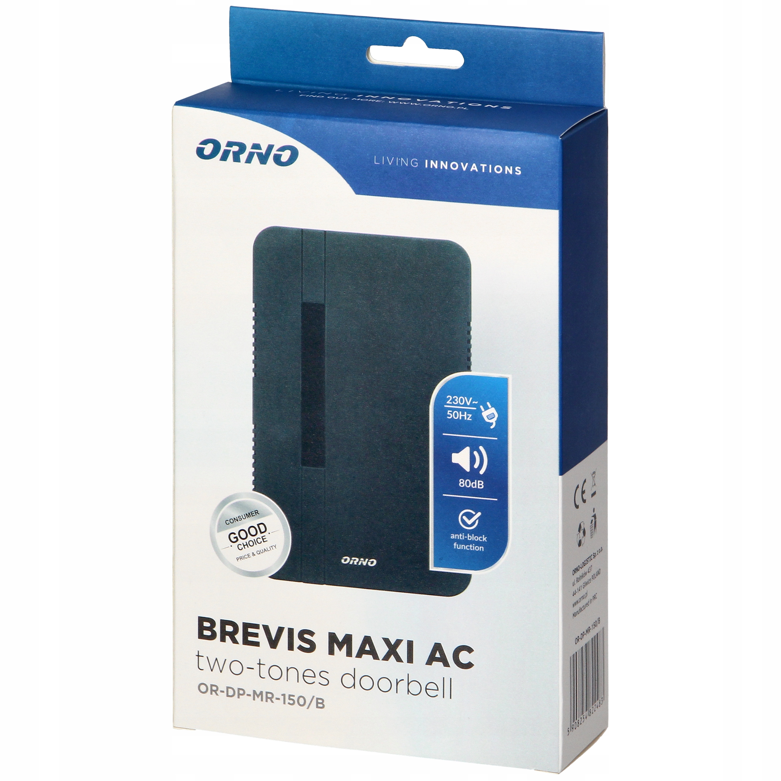 Двоколірний дзвінок BREVIS MAXI AC - це простий в установці та зручний у використанні електромеханічний дзвінок з функцією антиблокування перемикача - захищений від пошкоджень через примусову безперервну роботу