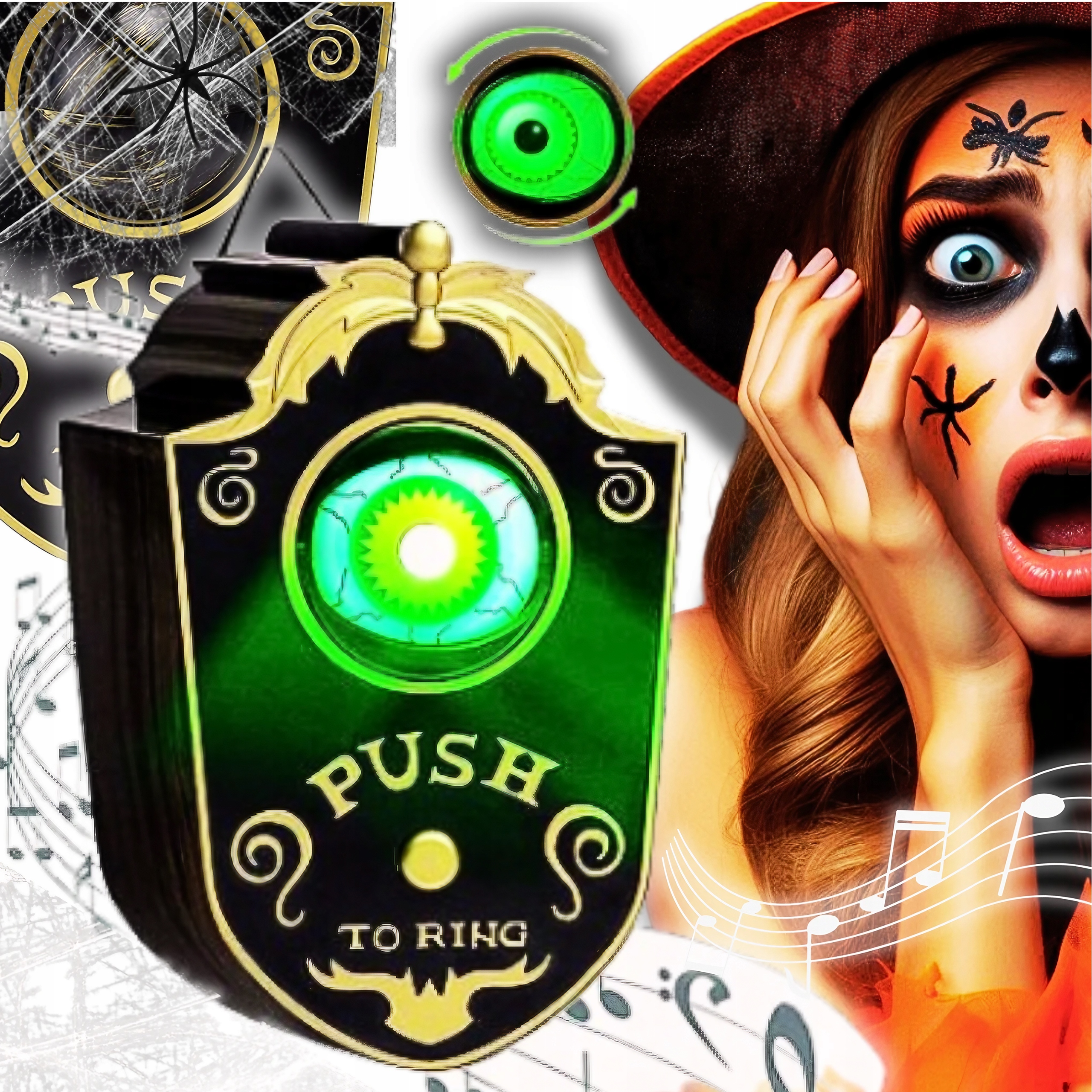 ✔️ Уявіть, що ви відкриваєте посилку, яку ви щойно отримали від кур’єра, яка містить страшно крутий набір, який являє собою дверний дзвінок із оком, що випромінює зелене світлодіодне світло, безпечне для ваших очей, від якого холоне кров привітання та велику білу павутину 60 г, якою ви можете прикрасити будь-яке місце, а нарешті помістити на неї двох чорних павуків.