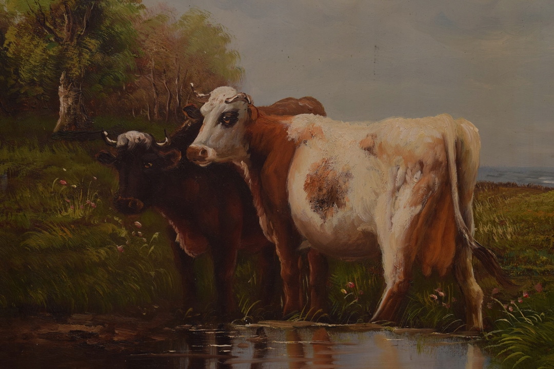 Дві корови на пасовищі - стара олійна картина - золота рамка