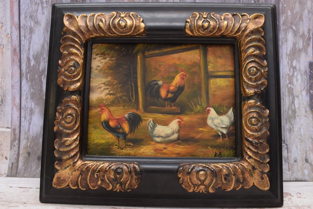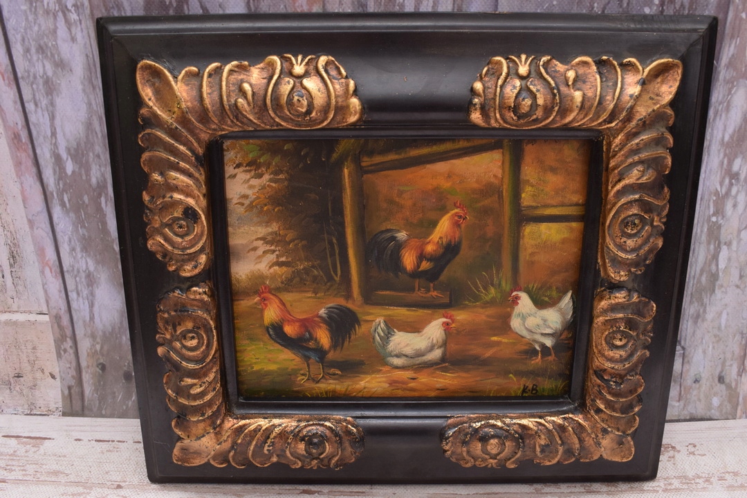 Дві курки, два півні, півень - ферма - картина маслом - чорно-золота рамка